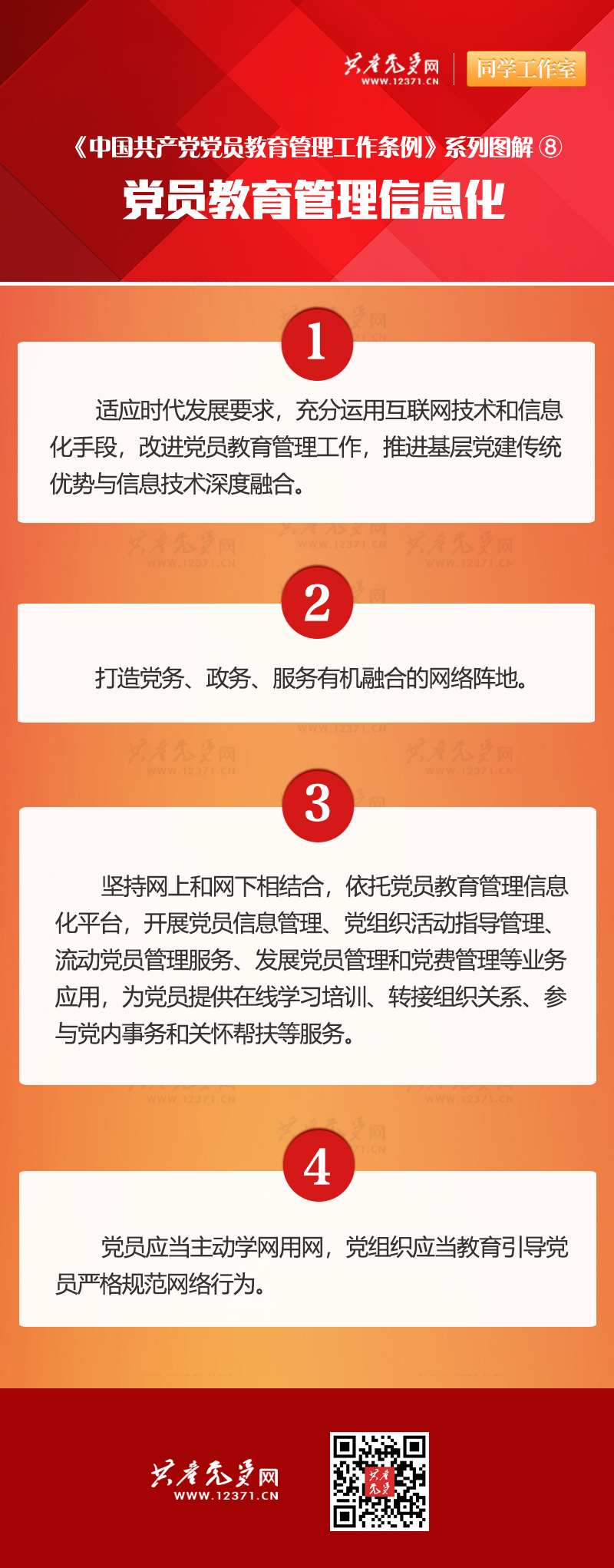 第三十五條 適應(yīng)時(shí)代發(fā)展要求,充分運(yùn)用互聯(lián)網(wǎng)技術(shù)和信息化手段,改進(jìn)黨員教育管理工作,推進(jìn)基層黨建傳統(tǒng)優(yōu)勢(shì)與信息技術(shù)深度融合,不斷提高黨員教育管理現(xiàn)代化水平。