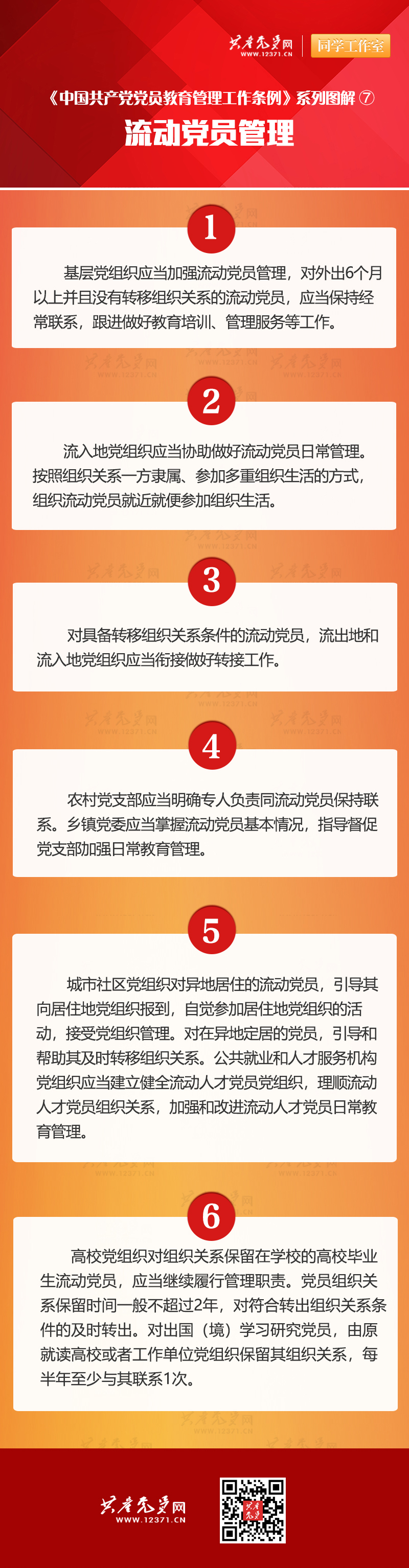 流入地黨組織應(yīng)當(dāng)協(xié)助做好流動(dòng)黨員日常管理。按照組織關(guān)系一方隸屬、參加多重組織生活的方式,組織流動(dòng)黨員就近就便參加組織生活。鄉(xiāng)鎮(zhèn)、街道、村、社區(qū)、園區(qū)等黨群服務(wù)中心應(yīng)當(dāng)向流動(dòng)黨員開(kāi)放。流動(dòng)黨員可以在流入地黨組織或者流動(dòng)黨員黨組織參加民主評(píng)議。