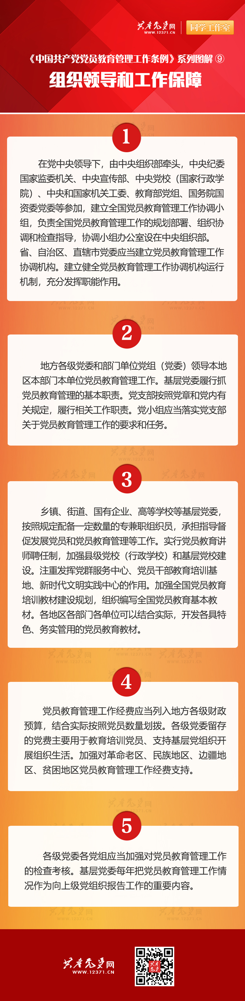 中央組織部主要負(fù)責(zé)黨員教育管理工作統(tǒng)籌協(xié)調(diào),抓好黨員集中教育和經(jīng)常性教育的組織安排,加強(qiáng)對(duì)黨員教育管理工作的具體指導(dǎo)。
