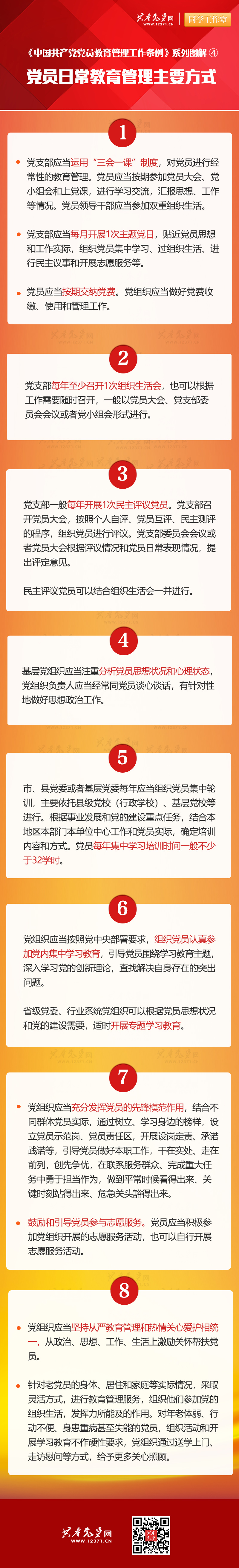 第二條 黨員教育管理是黨的建設(shè)基礎(chǔ)性經(jīng)常性工作。黨組織應(yīng)當(dāng)加強(qiáng)黨員教育管理,引導(dǎo)黨員堅(jiān)定共產(chǎn)主義遠(yuǎn)大理想和中國(guó)特色社會(huì)主義共同理想,增強(qiáng)“四個(gè)意識(shí)”、堅(jiān)定“四個(gè)自信”、做到“兩個(gè)維護(hù)”,增強(qiáng)黨性,提高素質(zhì),認(rèn)真履行義務(wù),正確行使權(quán)利,充分發(fā)揮先鋒模范作用。