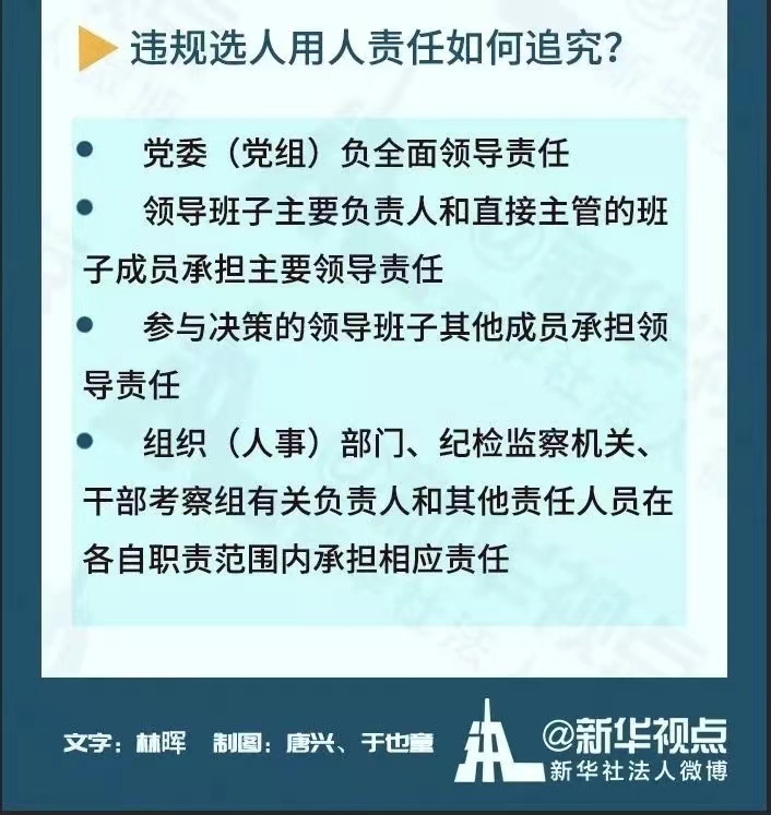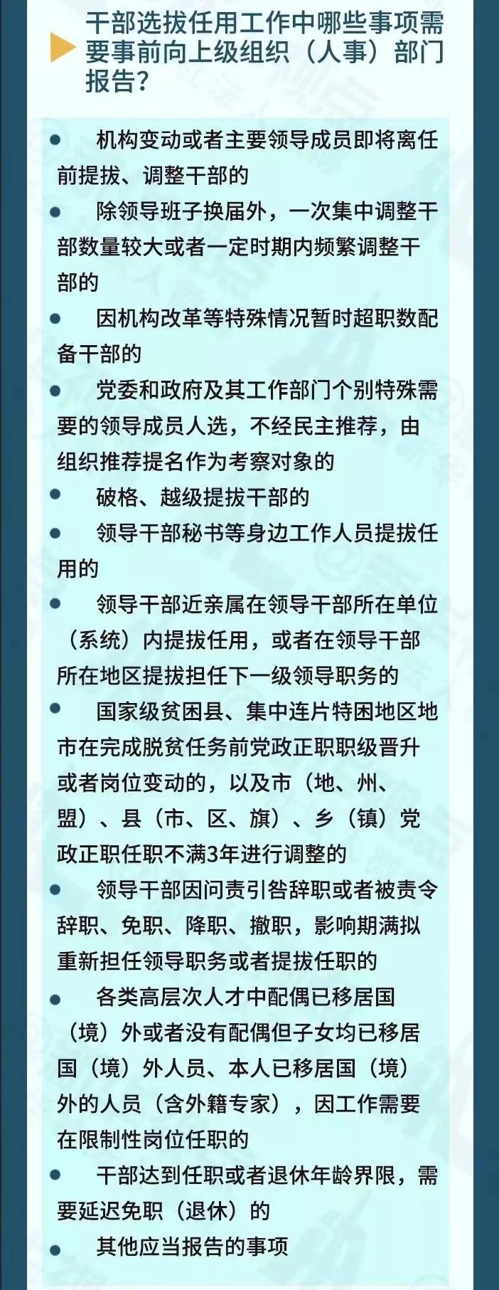 第一條 為了落實全面從嚴治黨和從嚴管理干部要求,規(guī)范干部選拔任用工作監(jiān)督檢查和責任追究,根據(jù)《黨政領(lǐng)導干部選拔任用工作條例》、《中國共產(chǎn)黨黨內(nèi)監(jiān)督條例》、《中國共產(chǎn)黨問責條例》等黨內(nèi)法規(guī),制定本辦法。 第二條 干部選拔任用工作監(jiān)督檢查和責任追究,堅持以習近平新時代中國特色社會主義思想為指導,貫徹新時代黨的組織路線,落實新時期好干部標準,樹立正確導向,突出政治監(jiān)督,從嚴查處違規(guī)用人問題和選人用人中的不正之風,嚴肅追究失職失察責任,促進形成風清氣正的用人生態(tài)。 第三條 干部選拔任用工作監(jiān)督檢查和責任追究,堅持黨委(黨組)領(lǐng)導、分級負責,實事求是、依法依規(guī),發(fā)揚民主、群眾參與,分類施策、精準有效,防治并舉、失責必究。 第四條 黨委(黨組)及其組織(人事)部門按照職責權(quán)限,負責干部選拔任用工作的監(jiān)督檢查和責任追究,紀檢監(jiān)察機關(guān)、巡視巡察機構(gòu)按照有關(guān)規(guī)定履行干部選拔任用工作監(jiān)督職責。 中央組織部負責監(jiān)督檢查和責任追究工作的宏觀指導,地方黨委組織部和垂直管理單位組織(人事)部門負責指導本地區(qū)本系統(tǒng)的監(jiān)督檢查和責任追究工作。 第五條 本辦法適用于各級黨的機關(guān)、人大機關(guān)、行政機關(guān)、政協(xié)機關(guān)、監(jiān)察機關(guān)、審判機關(guān)、檢察機關(guān)以及事業(yè)單位、群團組織、國有企業(yè)干部選拔任用工作的監(jiān)督檢查和責任追究。 第二章 監(jiān)督檢查重點內(nèi)容 第六條 堅持黨管干部原則情況。重點監(jiān)督檢查是否按照干部管理權(quán)限由黨委(黨組)履行干部選拔任用責任,是否按照民主集中制和黨委(黨組)議事規(guī)則、決策程序討論決定干部任免事項。 第七條 堅持好干部標準和樹立正確用人導向情況。重點監(jiān)督檢查是否堅持德才兼?zhèn)?、以德為先,堅持五湖四海、任人唯賢,堅持事業(yè)為上、公道正派;是否堅持新時期好干部標準,嚴把政治關(guān)、品行關(guān)、能力關(guān)、作風關(guān)、廉潔關(guān),選拔任用忠誠干凈擔當?shù)母刹俊?/span> 第八條 執(zhí)行干部選拔任用工作政策規(guī)定情況。重點監(jiān)督檢查是否按照機構(gòu)規(guī)格和職數(shù)、資格條件、工作程序選拔任用干部;是否深入考察,認真查核,對人選嚴格把關(guān);是否嚴格執(zhí)行交流、回避、任期、退休、干部選拔任用請示報告等制度規(guī)定;是否嚴格落實干部管理監(jiān)督制度。 第九條 遵守組織人事紀律和匡正選人用人風氣情況。重點監(jiān)督檢查是否嚴格遵守干部選拔任用工作紀律,是否采取有力措施嚴肅查處和糾正選人用人不正之風。 第十條 促進干部擔當作為情況。重點監(jiān)督檢查是否采取有效措施激勵干部擔當作為,是否對不擔當不作為的干部嚴格管理、嚴肅問責。 第三章 監(jiān)督檢查工作機制 第十一條 建立健全干部選拔任用工作組織監(jiān)督、民主監(jiān)督機制,把專項檢查與日常監(jiān)督結(jié)合起來,將監(jiān)督檢查貫穿干部選拔任用工作全過程。 第十二條 強化上級黨組織監(jiān)督檢查。主要采取任前事項報告、“一報告兩評議”、專項檢查、離任檢查、問題核查等方式進行。 第十三條 完善黨委(黨組)領(lǐng)導班子內(nèi)部監(jiān)督。黨委(黨組)研究干部任免事項,應當把醞釀貫穿始終,認真聽取班子成員意見。會議討論決定時,領(lǐng)導班子成員應當逐一發(fā)表意見,主要負責人最后表態(tài)。領(lǐng)導班子成員對人選意見分歧較大時,應當暫緩表決。不得以個別征求意見、領(lǐng)導圈閱等形式代替集體討論決定。 第十四條 健全組織(人事)部門內(nèi)部監(jiān)督。選拔任用領(lǐng)導干部應當向干部監(jiān)督機構(gòu)了解情況,干部監(jiān)督機構(gòu)負責人列席研究討論干部任免事項會議。認真執(zhí)行干部選拔任用工作紀實制度,建立自查制度,每年對干部選拔任用工作情況進行1次自查。 第十五條 拓寬群眾監(jiān)督渠道。認真查核和處理群眾舉報反映的問題,定期開展分析研判,及時研究提出工作意見。自覺接受輿論監(jiān)督,及時回應群眾關(guān)切。完善“12380”舉報受理平臺,提高舉報受理工作信息化水平。 第十六條 健全地方黨委干部選拔任用監(jiān)督工作聯(lián)席會議制度,加強有關(guān)部門的溝通協(xié)調(diào),形成監(jiān)督工作合力。聯(lián)席會議由組織部門召集,一般每年召開1次,重要情況隨時溝通。 第四章 任前事項報告 第十七條 在干部選拔任用工作中,有下列情形之一,應當在事前向上級組織(人事)部門報告: (一)機構(gòu)變動或者主要領(lǐng)導成員即將離任前提拔、調(diào)整干部的; (二)除領(lǐng)導班子換屆外,一次集中調(diào)整干部數(shù)量較大或者一定時期內(nèi)頻繁調(diào)整干部的; (三)因機構(gòu)改革等特殊情況暫時超職數(shù)配備干部的; (四)黨委和政府及其工作部門個別特殊需要的領(lǐng)導成員人選,不經(jīng)民主推薦,由組織推薦提名作為考察對象的; (五)破格、越級提拔干部的; (六)領(lǐng)導干部秘書等身邊工作人員提拔任用的; (七)領(lǐng)導干部近親屬在領(lǐng)導干部所在單