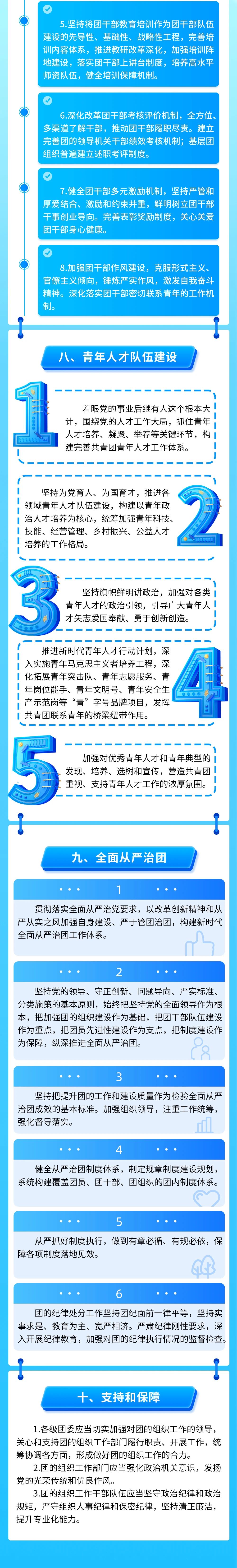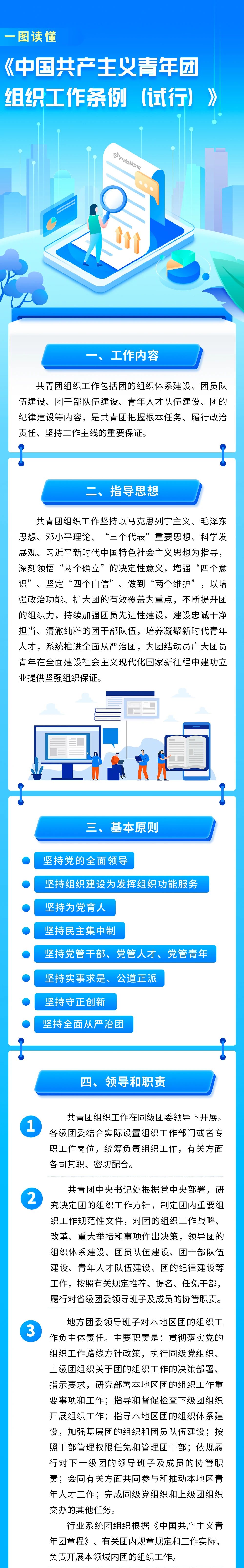 《條例》共分為九個章節(jié),從領(lǐng)導(dǎo)和職責(zé)、團(tuán)的組織體系建設(shè)、團(tuán)員隊伍建設(shè)、團(tuán)干部隊伍建設(shè)、青年人才隊伍建設(shè)、全面從嚴(yán)治團(tuán)、支持和保障等方面作出規(guī)定。