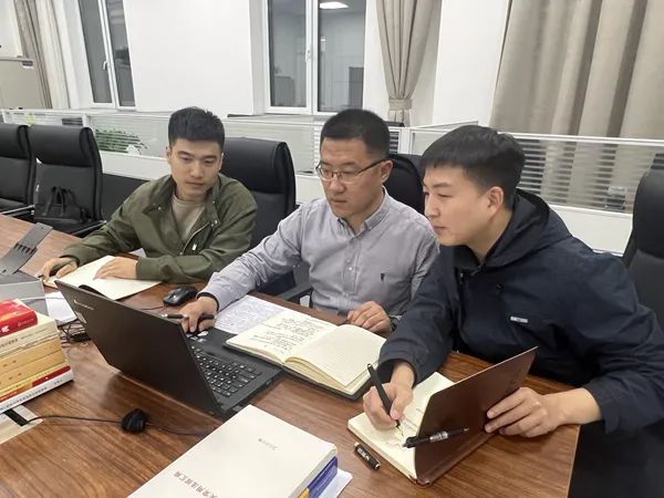 圖為張坤(中)正在與同事一起復(fù)盤工作完成情況,研究下一步工作。王一粟 攝