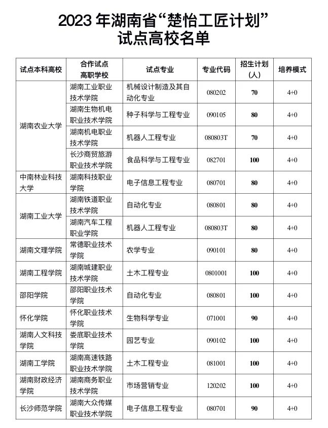 《通知》明確,“楚怡工匠計(jì)劃”招生對(duì)象為符合我省普通高校招生考試(含普通高考和對(duì)口招生考試)報(bào)名條件,并已參加我省普通高校招生考試報(bào)名的考生。試點(diǎn)學(xué)校為省屬有關(guān)普通本科高校與高水平高職院校,試點(diǎn)專業(yè)主要聚焦服務(wù)“三高四新”、鄉(xiāng)村振興戰(zhàn)略的專業(yè)。培養(yǎng)模式將采取“4+0”模式(4年均在高職院校培養(yǎng))或“2+2”模式(本科高校和高職院校各培養(yǎng)2年),畢業(yè)后頒發(fā)本科院校畢業(yè)文憑。2023年,省教育廳遴選湖南農(nóng)業(yè)大學(xué)等11所本科高校、湖南工業(yè)職業(yè)技術(shù)學(xué)院等15所高職院校進(jìn)行試點(diǎn),試點(diǎn)總規(guī)模為1320人。