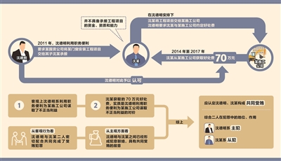 其中,2011年,沈德明利用擔(dān)任蘇州監(jiān)獄黨委書記、監(jiān)獄長的職務(wù)便利,要求蘇州監(jiān)獄相關(guān)工程的承建單位某國資公司將某門窗安裝工程項(xiàng)目交給沈某承接。沈某并不具備承接工程項(xiàng)目的資金、資質(zhì)和能力,在沈德明安排下,沈某將某門窗安裝工程項(xiàng)目交給某施工公司,沈德明要求沈某與某施工公司約定好處費(fèi)。2014年至2017年,沈某從某施工公司獲取好處費(fèi)70萬元,沈德明對(duì)此予以認(rèn)可。