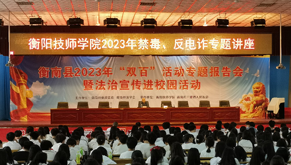 為學習宣傳貫徹習近平法治思想,弘揚法治精神,結合學習貫徹習近平新時代中國特色社會主義思想主題教育,6月6日,學院開展法治宣傳進行校園活動暨2023年禁毒、反電詐專題講座,并聯合衡南縣政法委舉辦衡陽市、衡南縣法學會“雙百”活動專題報告會。學院黨委副書記、院長廖與飛出席并致辭。衡陽市政法委二級調研員宋景軍,衡南縣委常委、縣委政法委書記蔡志剛出席活動。學院黨委委員、副院長王瀾主持報告會。