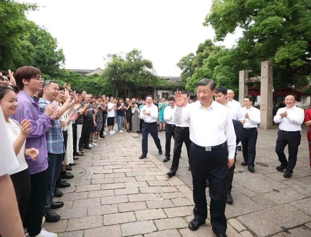 7月5日至7日,中共中央總書記、國家主席、中央軍委主席習(xí)近平在江蘇考察。這是6日上午,習(xí)近平在蘇州平江歷史文化街區(qū),向當(dāng)?shù)鼐用窈陀慰蛽]手致意。新華社記者 鞠鵬 攝