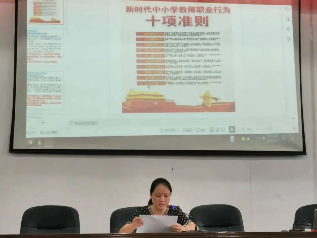 學(xué)校副科級紀(jì)檢員陽美平組織全體教師學(xué)習(xí)了《新時(shí)代中小學(xué)教師職業(yè)行為十項(xiàng)準(zhǔn)則》、《中小學(xué)教師違反職業(yè)道德行為處理辦法》等法律法規(guī),要求全體教師嚴(yán)格遵守教師職業(yè)道德,遵守廉潔從教紅線,嚴(yán)于律己,大力弘揚(yáng)高尚師德師風(fēng)。學(xué)習(xí)并剖析了2019年-2022年全國多個(gè)典型案例中存在的違紀(jì)違法行為,同時(shí)對學(xué)校教師進(jìn)行了警示提醒,要求全體教師從案例中汲取教訓(xùn)、自查自省,自覺做到從嚴(yán)修身、從嚴(yán)律己,培養(yǎng)高尚道德情操和健康向上的生活情趣,營造風(fēng)清氣正的育人環(huán)境。