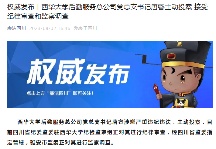 西華大學(xué)后勤服務(wù)總公司黨總支書記唐睿涉嫌嚴(yán)重違紀(jì)違法,主動(dòng)投案,目前四川省紀(jì)委監(jiān)委駐西華大學(xué)紀(jì)檢監(jiān)察組正對(duì)其進(jìn)行紀(jì)律審查,經(jīng)四川省監(jiān)委指定管轄,雅安市監(jiān)委正對(duì)其進(jìn)行監(jiān)察調(diào)查。