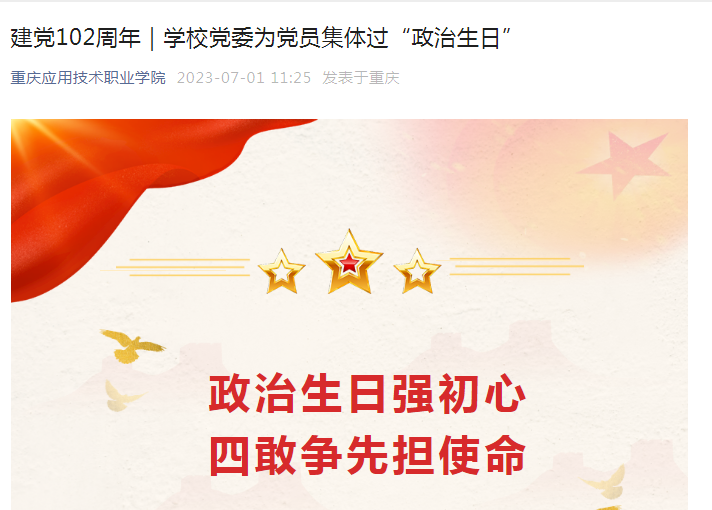 溫初心 鏗鏘誓言鑄忠誠 “我志愿加入中國共產(chǎn)黨,擁護(hù)黨的綱領(lǐng),遵守黨的章程……”全體黨員右拳高擎,莊嚴(yán)肅穆地重溫了入黨誓詞。黨員們仿佛又回到了入黨時的情景,用鏗鏘有力的聲音再次向黨作出莊嚴(yán)承諾,初心受到洗禮,理想信念更加堅定。 悟初心 使命在肩勇作為 “薛峰同志,2001年6月1日加入中國共產(chǎn)黨,黨齡21年;王書海同志,1996年6月3日加入中國共產(chǎn)黨,黨齡26年……”。工作人員宣讀完畢,王書海同志接過了“政治生日”賀卡、黨徽書簽和生日蛋糕,他反復(fù)端詳手里的“政治生日”賀卡,幸福溢于言表,心情久久不能平靜。王書海同志作為集體過“政治生日”黨員里黨齡最長的代表,和大家分享了自己的入黨志愿和入黨歷程,讓大家充分了解了九幾年部隊入黨的情形,讓大家感動萬分。 學(xué)校黨委在贈送賀卡的同時還為兩個校企合作單位送學(xué)贈書,并勉勵校企合作單位要積極參與學(xué)校學(xué)習(xí)貫徹習(xí)近平新時代中國特色社會主義思想主題教育和黨團(tuán)活動,確保學(xué)校和合作單位在各類學(xué)習(xí)、活動中強(qiáng)化溝通交流、不斷凝聚共識、深化校企合作,合力推進(jìn)學(xué)校人才培養(yǎng)計劃落地生根,合力推進(jìn)學(xué)校走內(nèi)涵式發(fā)道路目標(biāo)達(dá)成。 踐初心 砥礪奮進(jìn)從頭越 何菲同志再次向集體過“政治生日”的黨員表示熱烈的祝賀。她指出,共產(chǎn)黨員的生命有兩個起點:一個起點拉開人生的序幕,昭示著生命的伊始,記住它是對生命的珍視和珍重,紀(jì)念它是對賜予你生命的偉大母親的感動和感恩;另一個起點是政治生日,代表著初心與使命,并讓其奮斗終生!從加入中國共產(chǎn)黨之日起,政治生命就開始了,記住它是對黨的忠誠和信仰,紀(jì)念它是每一名共產(chǎn)黨員對黨的感激和感謝。每名黨員都應(yīng)該牢牢記住這兩個生日。她強(qiáng)調(diào),學(xué)校全體黨員干部要永遠(yuǎn)不忘初心,堅定信仰;要永遠(yuǎn)清白做人,干凈做事;要永遠(yuǎn)勇于擔(dān)當(dāng),敢于斗爭,要永遠(yuǎn)保持黨員先進(jìn)性,在各項工作中爭當(dāng)先鋒、接續(xù)奮斗,在崗位履職盡責(zé)上有所作為,在學(xué)校事業(yè)發(fā)展關(guān)鍵期有所建樹! “一句誓言、一生作答”!儀式感滿滿的“政治生日”是難得的黨性鍛煉,也是黨員成長進(jìn)步的新起點。大家紛紛表示,將以踔厲奮發(fā)的昂揚姿態(tài),勇毅前行,發(fā)揚“四敢”精神,以“敢”字創(chuàng)先、以“干”字爭優(yōu),以實干擔(dān)當(dāng)開啟學(xué)校高質(zhì)量發(fā)展新篇章。