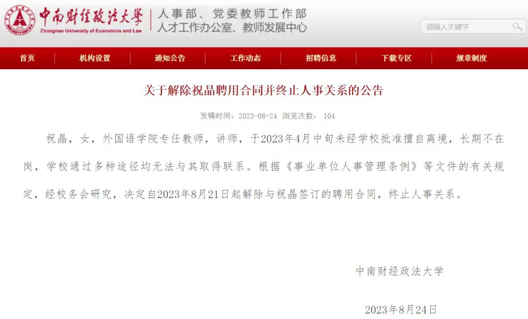 中南財(cái)經(jīng)政法大學(xué)教師祝晶未經(jīng)學(xué)校批準(zhǔn)擅自離境,長(zhǎng)期不在崗,無(wú)法取得聯(lián)系,被解除聘用合同