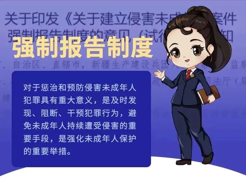 2020年5月,最高人民檢察院、國家監(jiān)察委員會、教育部等九部門聯(lián)合印發(fā)《關于建立侵害未成年人案件強制報告制度的意見(試行)》(以下簡稱“意見”),2021年6月1日開始實施的新《中華人民共和國未成年人保護法》從法律層面確認了強制報告制度,對加強未成年人的全面綜合司法保護,及時有效懲治侵害未成年人違法犯罪起到重要作用。