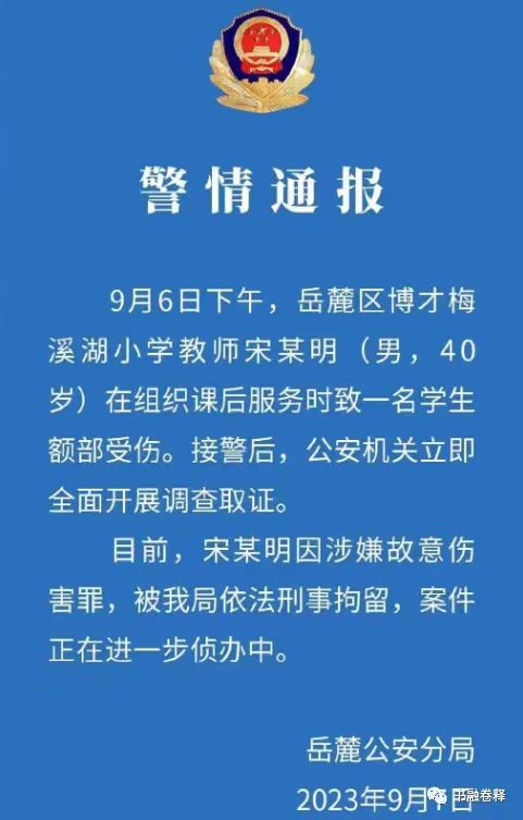 岳麓區(qū)博才梅溪湖小學(xué)教師宋某明涉嫌故意傷害學(xué)生致額部受傷