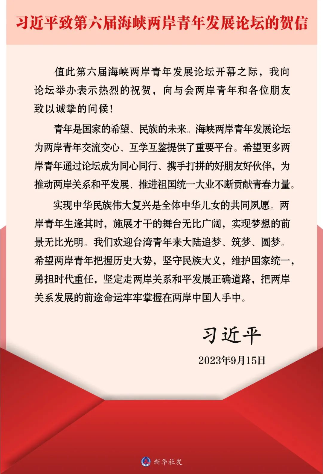 中共中央總書記、國家主席習(xí)近平9月15日向第六屆海峽兩岸青年發(fā)展論壇致賀信。