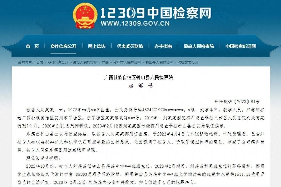 9月14日,廣西壯族自治區(qū)鐘山縣人民檢察院公布了一則起訴書,中學(xué)女教師挪用學(xué)費(fèi)賭博,并將班費(fèi)、水費(fèi)用于個(gè)人生活開支,檢方以挪用資金罪提起公訴。