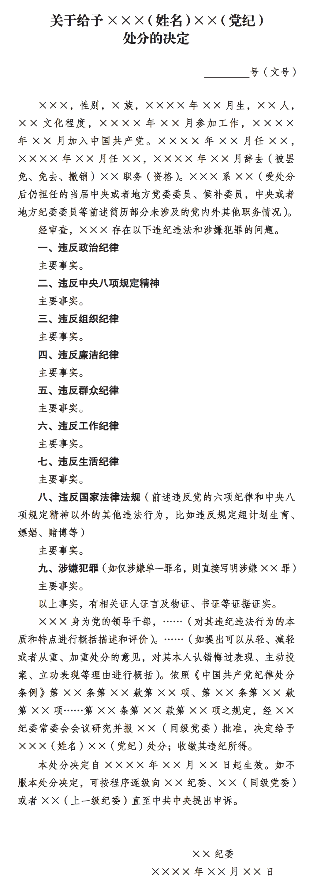 黨紀(jì)處分決定書(shū)模板