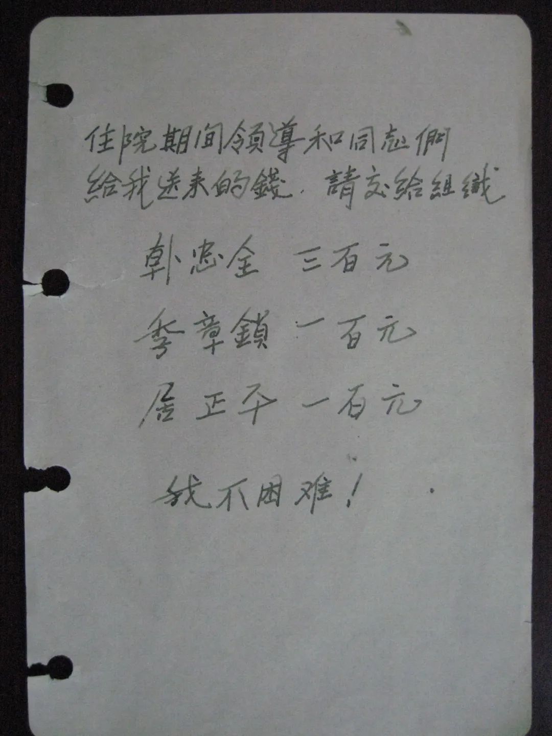 1970年的國慶節(jié)剛過,鐵人的病情急劇惡化。彌留之際,鐵人王進(jìn)喜最后想到的仍然是黨和國家的利益。他用顫抖的手取出一個(gè)小紙包交給探望他的一位領(lǐng)導(dǎo)同志,里面是他住院后各級(jí)組織給他的500元錢補(bǔ)助費(fèi)和一張記賬單,每一筆都記得清清楚楚。其中鉆井指揮部補(bǔ)助給他的300元錢,由時(shí)任鉆井指揮部黨委副書記的韓忠全代表組織送到北京301醫(yī)院,鐵人堅(jiān)決不收。韓忠全趁鐵人不注意時(shí)偷偷塞進(jìn)了被褥。這些錢,鐵人一分也沒有動(dòng)。他說:“請(qǐng)組織把它花到最需要的地方去,我不困難?!痹谒睦?,裝的永遠(yuǎn)是組織和群眾,唯獨(dú)沒有他自己。