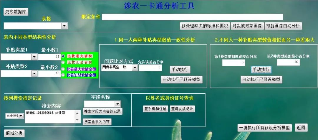 此分析工具設(shè)置了11個標簽,給每個發(fā)放對象進行“畫像”,標簽越多的疑點越突出。如設(shè)置了“是否村干部”標簽,重點關(guān)注村干部在涉農(nóng)資金的分配中是否存在問題。為降低審計人員的使用難度,25個數(shù)據(jù)分析模型集成到了“一鍵執(zhí)行所有預(yù)設(shè)分析模型”按鈕中,一鍵直接將分析結(jié)果導(dǎo)出為電子表格。有特殊需求的審計人員還可通過手動選擇參數(shù)方式進一步分析,無需編寫sql語句就可實現(xiàn)“吃點菜”。同時工具還會生成“發(fā)放對象畫像表”、“村干部表”、“生產(chǎn)型或崗位每月500元以上發(fā)放表”三張基礎(chǔ)表,為其他審計項目提供基礎(chǔ)比對數(shù)據(jù)。