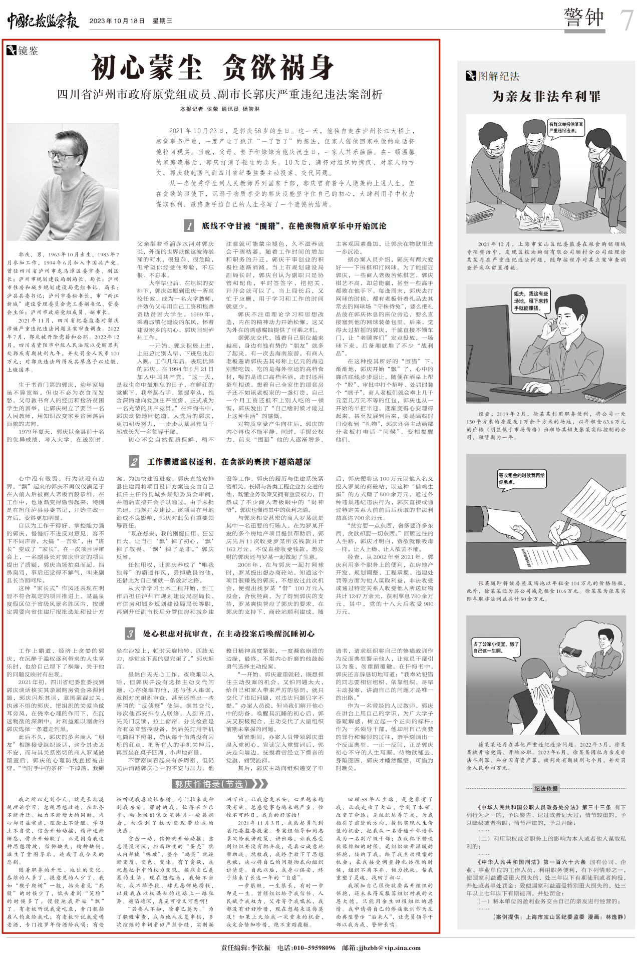 不矜細(xì)行,終累大德。經(jīng)查,郭慶利用職務(wù)便利,在房地產(chǎn)開發(fā)、規(guī)劃調(diào)整、工程承攬、違建處罰等方面為他人謀取利益,非法收受或通過特定關(guān)系人收受他人所送財物共計1247萬余元。最終,郭慶被開除黨籍和公職,判處有期徒刑九年,并處罰金100萬元。
