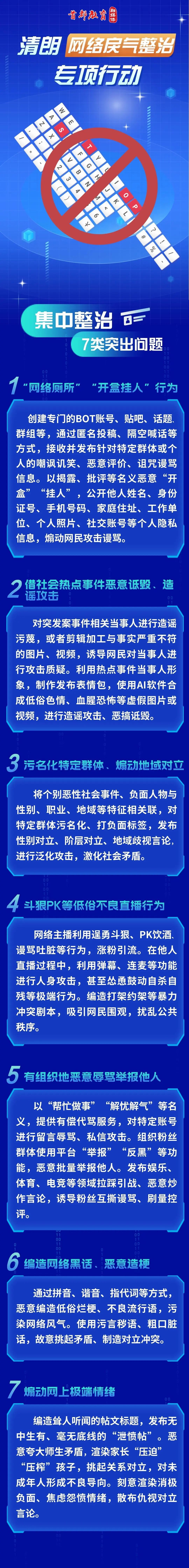 按照2023年“清朗”系列專項行動總體安排,中央網(wǎng)信辦決定即日起在全國范圍內(nèi)啟動為期1個月的“清朗·網(wǎng)絡(luò)戾氣整治”專項行動?,F(xiàn)將有關(guān)事項通知如下。
