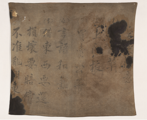 藏品:寫(xiě)有“六項(xiàng)注意”的包袱皮,系井岡山時(shí)期紅四軍一位戰(zhàn)士用過(guò)的物品,縱85.7厘米,橫94厘米,布質(zhì),上面有毛筆書(shū)寫(xiě)的文字。一般在行軍時(shí),戰(zhàn)士們用它包裹衣物,宿營(yíng)時(shí)掛起來(lái)可以作宣傳。1959年5月江西省博物館撥交中央革命博物館籌備處(今中國(guó)國(guó)家博物館)入藏。