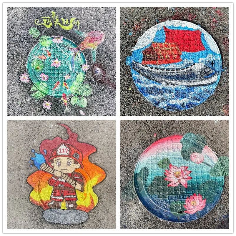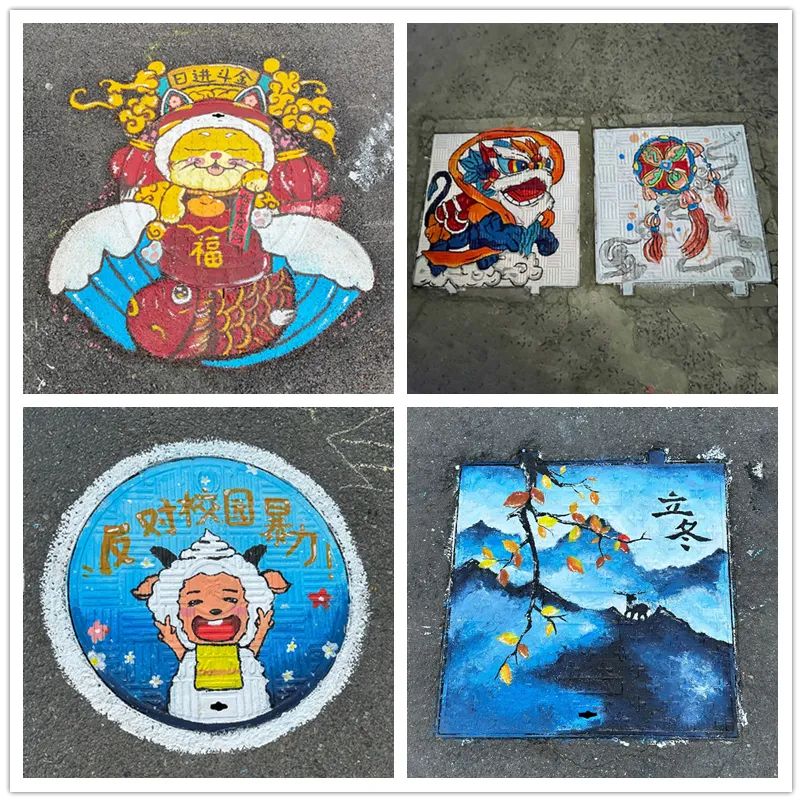近日,走在安徽建工技師學(xué)院的校園里,你會被主干道窨井蓋上的水彩畫所吸引。原本生冷的窨井蓋變得色彩繽紛,上面畫著可愛的卡通人物、傳統(tǒng)的中國畫、生動的醒獅……不同風(fēng)格的井蓋創(chuàng)意手工畫讓校園充滿了藝術(shù)范兒。