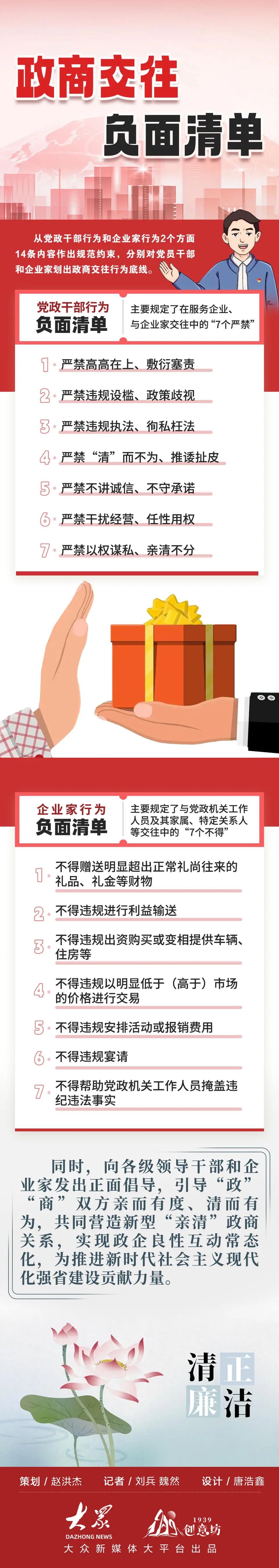 “在2019年印發(fā)的意見基礎(chǔ)上,這次出臺的兩份清單從黨政干部和企業(yè)家兩個方面作出規(guī)范約束,更加注重政商雙方的‘雙向奔赴、親清統(tǒng)一’,更加注重提升黨政干部對企業(yè)的服務(wù)意識?!笔〖o委監(jiān)委黨風政風監(jiān)督室負責同志介紹。在負面清單基礎(chǔ)上,同時發(fā)出正面倡導(dǎo):各級領(lǐng)導(dǎo)干部要坦蕩真誠同企業(yè)家交往,主動作為、靠前服務(wù),一視同仁對待各類經(jīng)營主體,依法依規(guī)為企業(yè)和企業(yè)家解難題、辦實事,做到“有求必應(yīng)、無事不擾”;企業(yè)家要積極主動與各級黨委、政府溝通交流,潔身自好走正道,遵紀守法辦企業(yè),光明正大搞經(jīng)營。