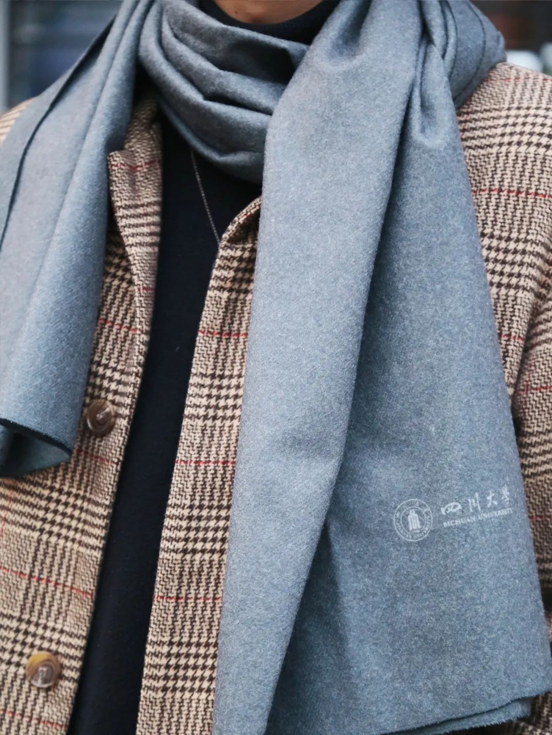 低調(diào)沉穩(wěn)、嚴(yán)謹(jǐn)務(wù)真的深灰鋪底,并將川大校徽印在圍巾一側(cè),就像百年川大的莊嚴(yán)樸實?;究罡蓛艉喖s又百搭,無論是搭配外套還是毛衣,都能輕松hold住,溫暖又時尚。
