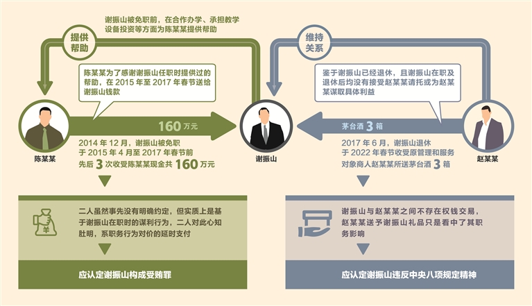 趙春玲:經(jīng)查,謝振山被免職后,于2015年4月至2017年春節(jié)前,先后3次收受陳某某現(xiàn)金共160萬(wàn)元;謝振山退休后,于2022年春節(jié)收受原管理和服務(wù)對(duì)象商人趙某某所送茅臺(tái)酒3箱。因上述行為發(fā)生在謝振山退出領(lǐng)導(dǎo)崗位后,我們著重從謝振山與二人的平日交往、有無(wú)經(jīng)濟(jì)往來(lái)、收受時(shí)間、往來(lái)緣由、是否有謀利事項(xiàng)等方面收集固定證據(jù)。最終查明,160萬(wàn)元系陳某某為感謝謝振山在任時(shí)提供的幫助而送,應(yīng)認(rèn)定謝振山收受160萬(wàn)元的行為構(gòu)成受賄罪;謝振山在退休后收受趙某某為了維持關(guān)系而送的茅臺(tái)酒,應(yīng)認(rèn)定為違反中央八項(xiàng)規(guī)定精神。