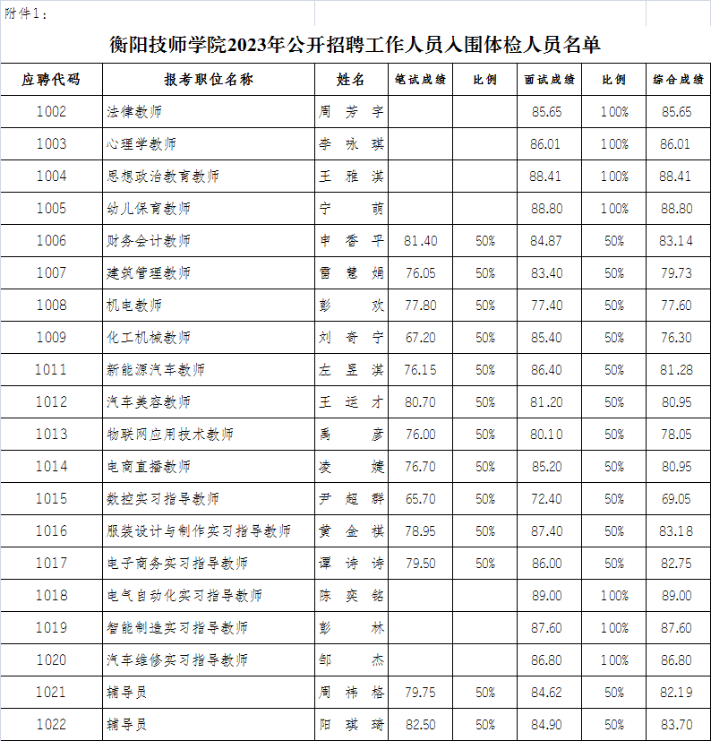 根據(jù)《衡陽技師學(xué)院2023年公開招聘工作人員公告》的規(guī)定,我院公開招聘工作人員筆試、面試(試教、實(shí)操)工作已結(jié)束?,F(xiàn)將入圍體檢人員名單予以公布,同時(shí)將體檢有關(guān)事項(xiàng)公告如下: