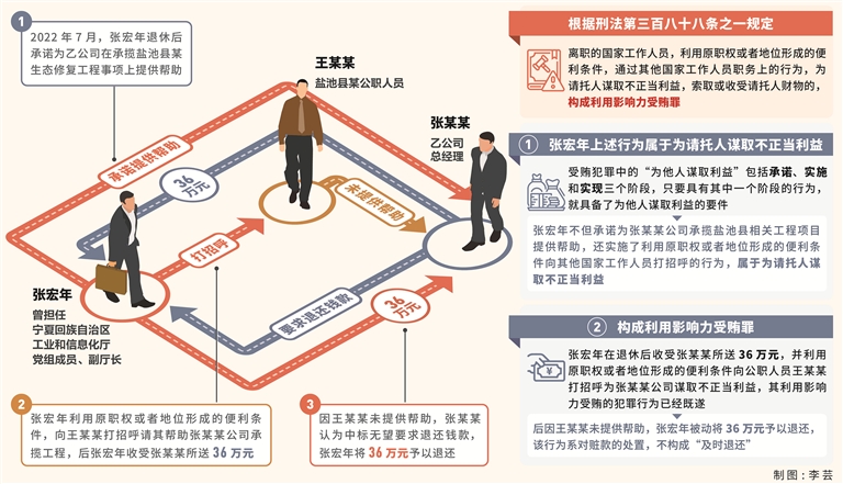 其中,2022年7月,張宏年在退休后接受乙公司總經(jīng)理張某某請(qǐng)托,承諾為乙公司在承攬鹽池縣某生態(tài)修復(fù)工程事項(xiàng)上提供幫助,后張宏年利用曾擔(dān)任寧夏回族自治區(qū)工業(yè)和信息化廳黨組成員、副廳長(zhǎng)職權(quán)或者地位形成的便利條件,向鹽池縣某公職人員王某某打招呼,請(qǐng)其對(duì)乙公司中標(biāo)相關(guān)工程項(xiàng)目給予關(guān)照。張宏年收受張某某所送現(xiàn)金36萬(wàn)元。因王某某未提供幫助。一周后,張某某認(rèn)為中標(biāo)無(wú)望要求退還錢款,張宏年將36萬(wàn)元予以退還。