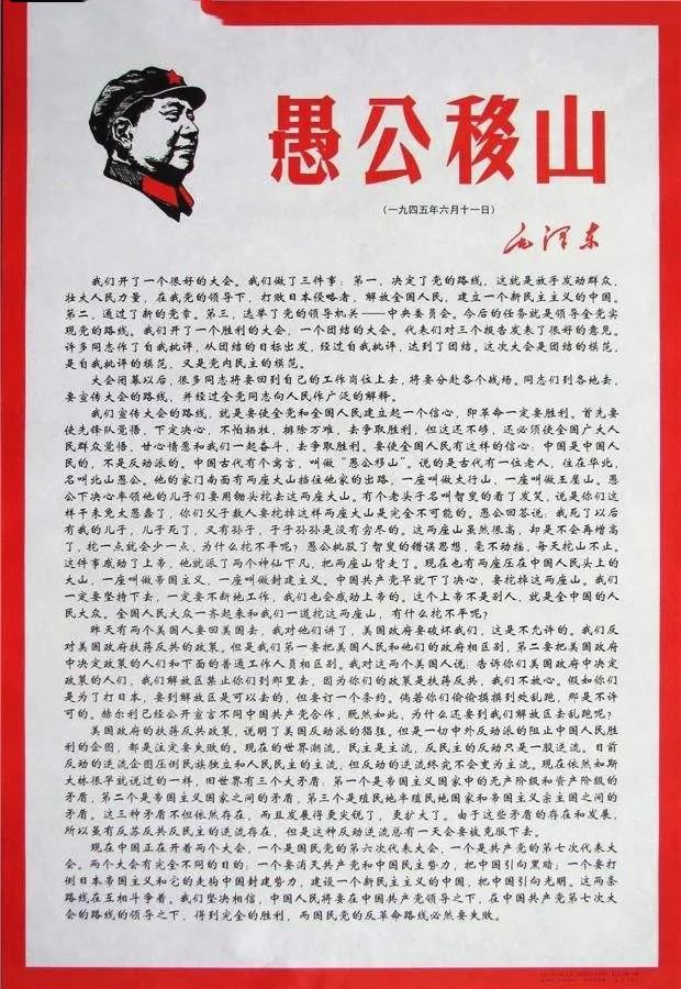 我們宣傳大會的路線,就是要使全黨和全國人民建立起一個信心,即革命一定要勝利。首先要使先鋒隊覺悟,下定決心,不怕犧牲,排除萬難,去爭取勝利。但這還不夠,還必須使全國廣大人民群眾覺悟,甘心情愿和我們一起奮斗,去爭取勝利。要使全國人民有這樣的信心:中國是中國人民的,不是反動派的。中國古代有個寓言,叫做“愚公移山”。說的是古代有一位老人,住在華北,名叫北山愚公。他的家門南面有兩座大山擋住他家的出路,一座叫做太行山,一座叫做王屋山。愚公下決心率領(lǐng)他的兒子們要用鋤頭挖去這兩座大山。有個老頭子名叫智叟的看了發(fā)笑,說是你們這樣干未免太愚蠢了,你們父子數(shù)人要挖掉這樣兩座大山是完全不可能的。愚公回答說:我死了以后有我的兒子,兒子死了,又有孫子,子子孫孫是沒有窮盡的。這兩座山雖然很高,卻是不會再增高了,挖一點就會少一點,為什么挖不平呢?愚公批駁了智叟的錯誤思想,毫不動搖,每天挖山不止。這件事感動了上帝,他就派了兩個神仙下凡,把兩座山背走了。現(xiàn)在也有兩座壓在中國人民頭上的大山,一座叫做帝國主義,一座叫做封建主義。中國共產(chǎn)黨早就下了決心,要挖掉這兩座山。我們一定要堅持下去,一定要不斷地工作,我們也會感動上帝的。這個上帝不是別人,就是全中國的人民大眾。全國人民大眾一齊起來和我們一道挖這兩座山,有什么挖不平呢?