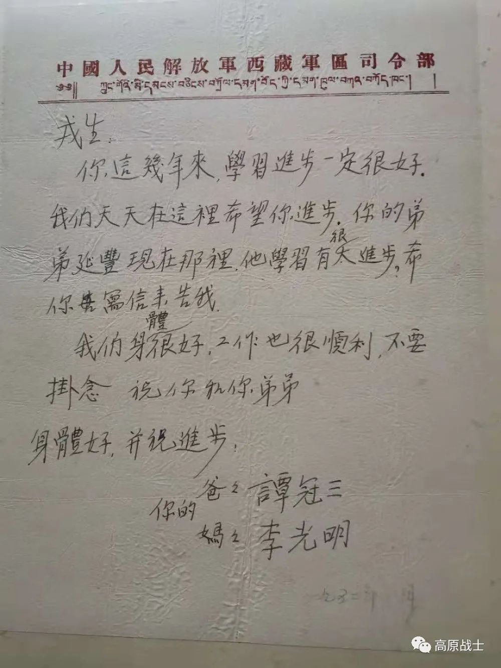 1958年,那時(shí)的譚戎生讀高中二年級(jí),學(xué)校利用假期開展勤工儉學(xué),組織大家參與公益勞動(dòng)。由于責(zé)任心強(qiáng)、表現(xiàn)突出,譚戎生被選為體育委員。父親的話語如春風(fēng)一般溫暖著他。父親譚冠三將軍早年參加革命,曾參加過毛澤東領(lǐng)導(dǎo)的秋收起義,隨后參加了朱德和陳毅領(lǐng)導(dǎo)的湘南起義,上了井岡山,參加了萬里長征,抗擊過日本侵略者,挺進(jìn)大西南,建國初期奉命進(jìn)軍西藏,解放百萬農(nóng)奴,在西藏平叛指揮若定......他是“兩路”精神和老西藏精神的主要?jiǎng)?chuàng)建者與實(shí)踐者。譚戎生對(duì)父母為國家舍小家為大家的崇高精神而欽佩,以他們?yōu)樽院?!并以他們?yōu)榘駱樱?/span>