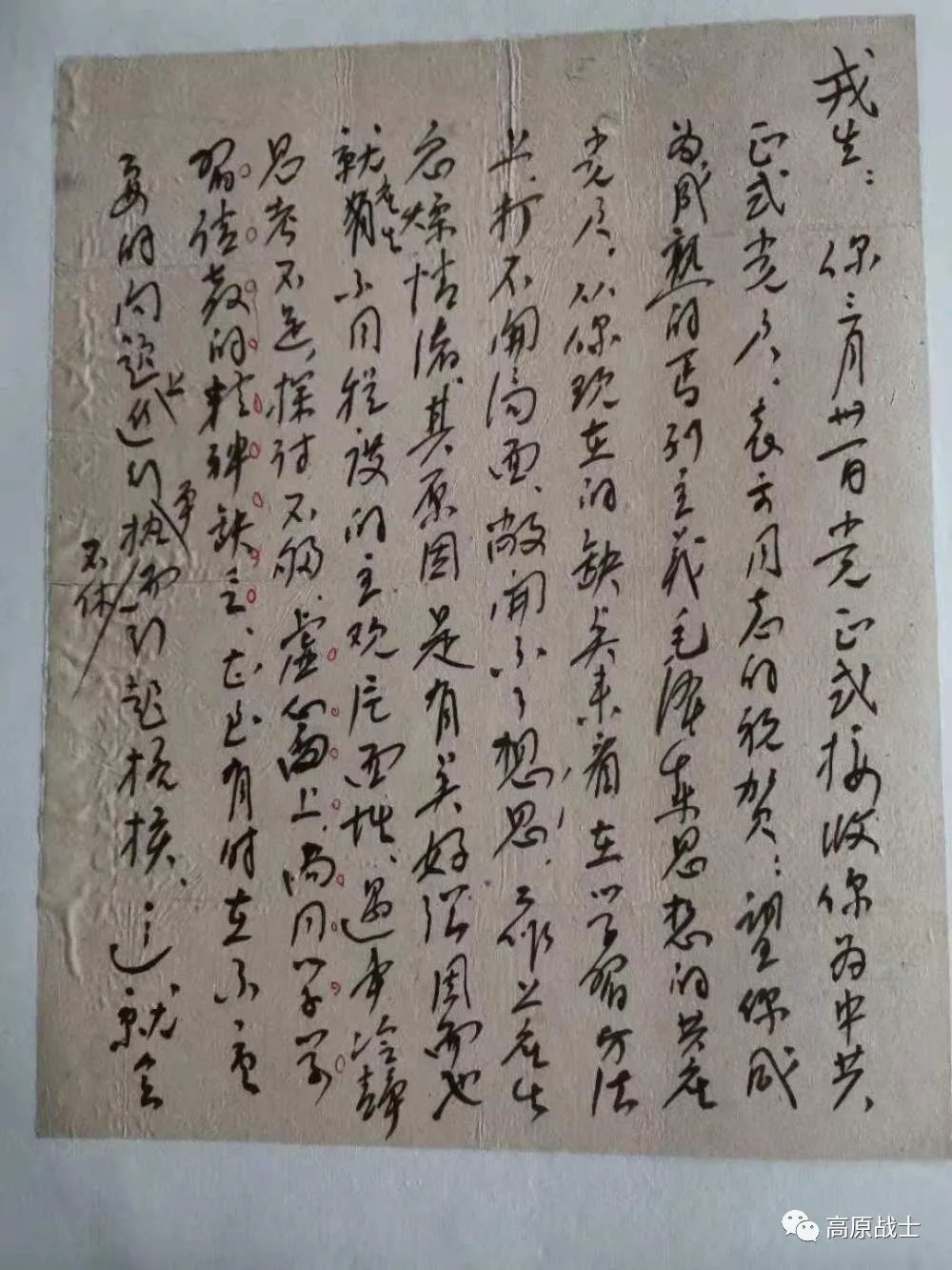 戎生你這幾年來,學(xué)習(xí)進(jìn)步一定很好。我們天天在這里希望你進(jìn)步。你的弟弟延豐現(xiàn)在那里,他學(xué)習(xí)有很大進(jìn)步?希你寫信來告我。我們身體很好,工作也很順利,不要掛念。祝你和你弟弟身體好,并祝進(jìn)步。