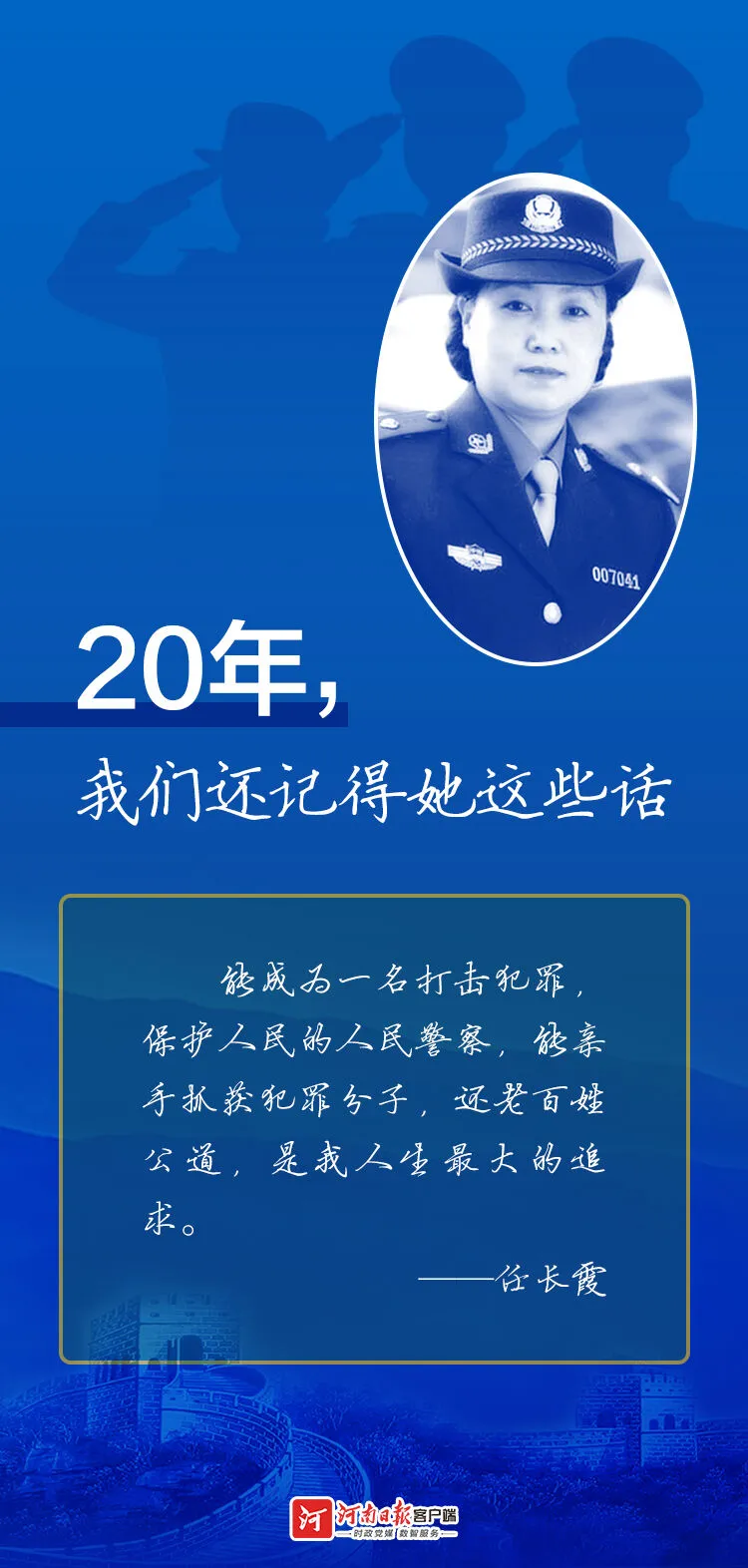 任長霞有句名言——“我認(rèn)為警察就是我的天職,為自己所執(zhí)著追求的事業(yè)而獻(xiàn)身,值!”這句話也激勵著一代代河南公安干警在忠實(shí)踐行對黨忠誠、服務(wù)人民、執(zhí)法公正、紀(jì)律嚴(yán)明總要求的道路上勇往直前,為建設(shè)更高水平的平安河南法治河南貢獻(xiàn)力量。