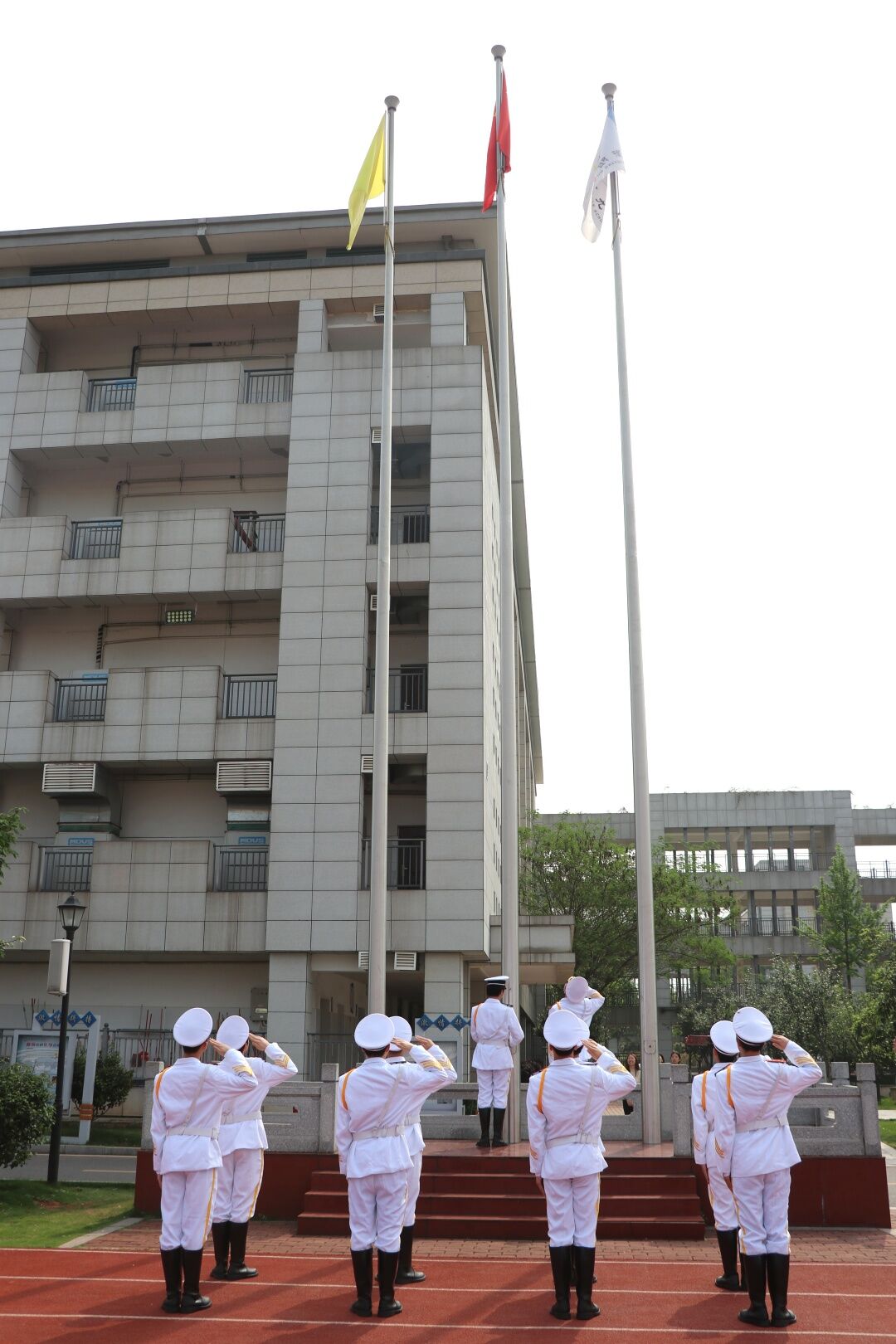 在莊嚴(yán)的國歌聲中,鮮艷的五星紅旗緩緩升起,迎風(fēng)飄揚(yáng)。全體師生整齊列隊(duì),神情肅穆,向國旗行注目禮。