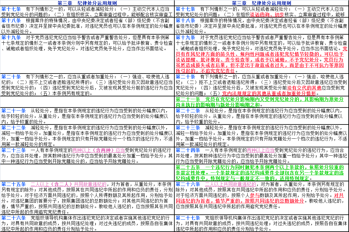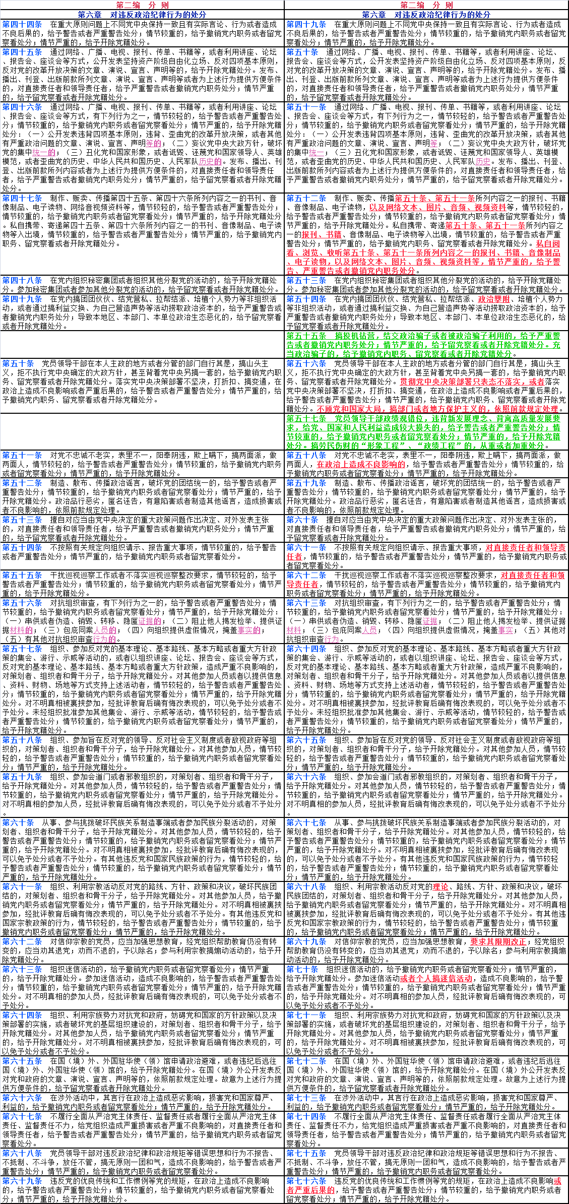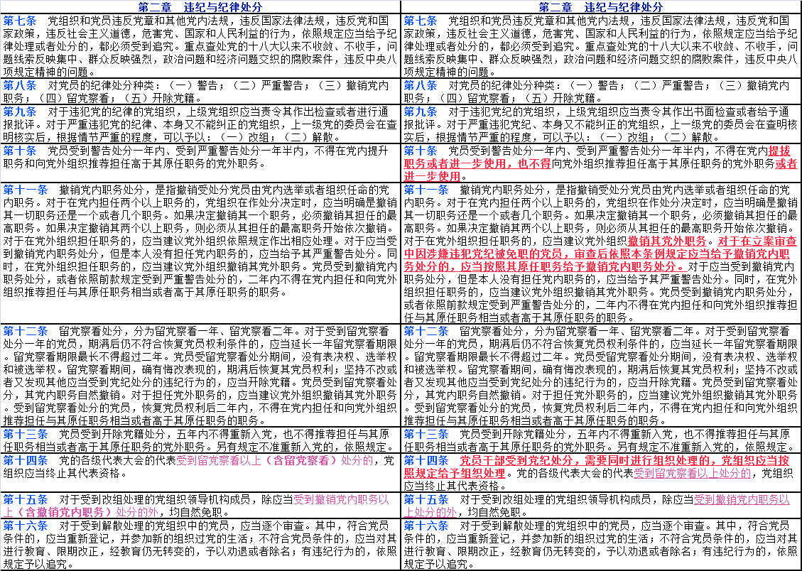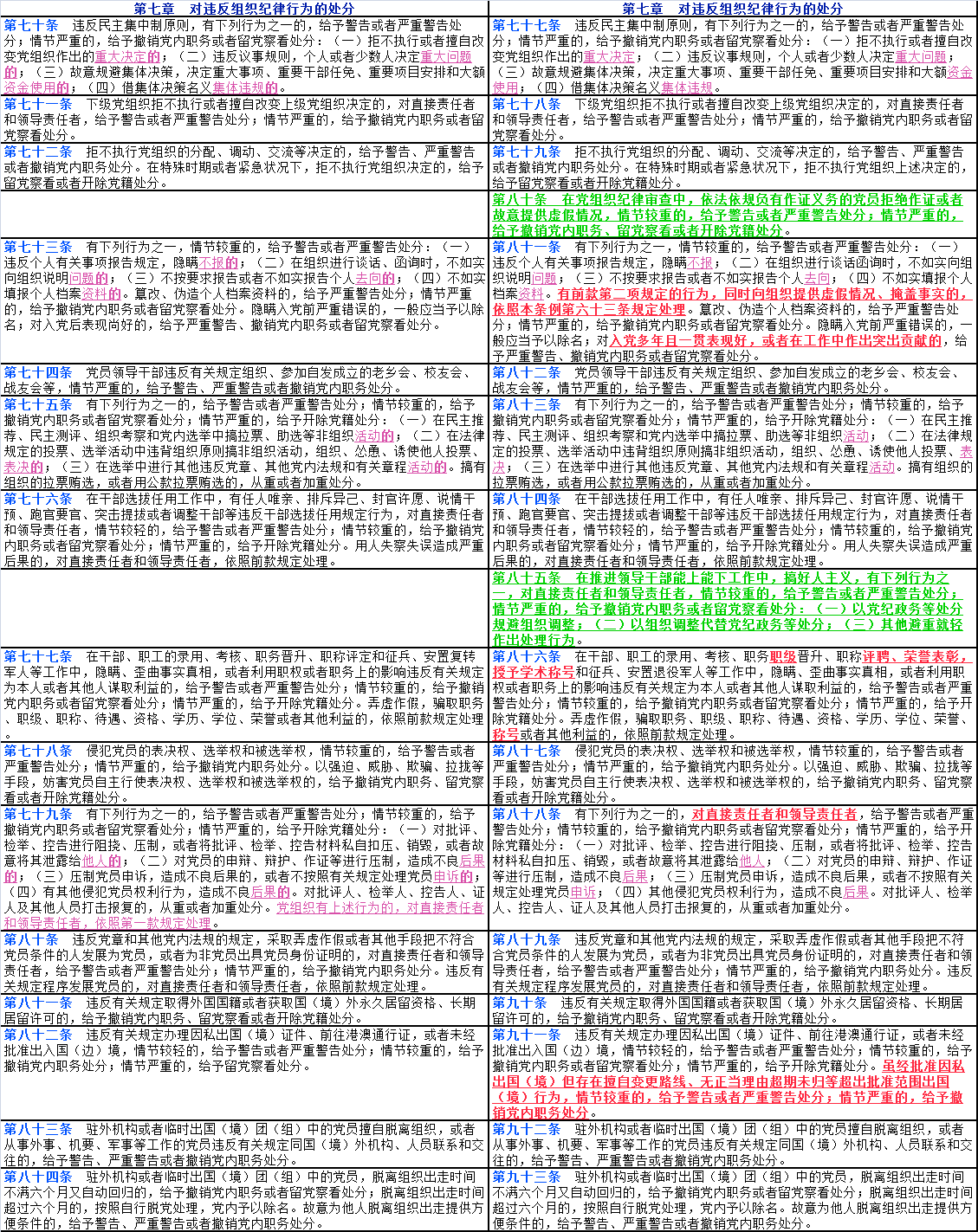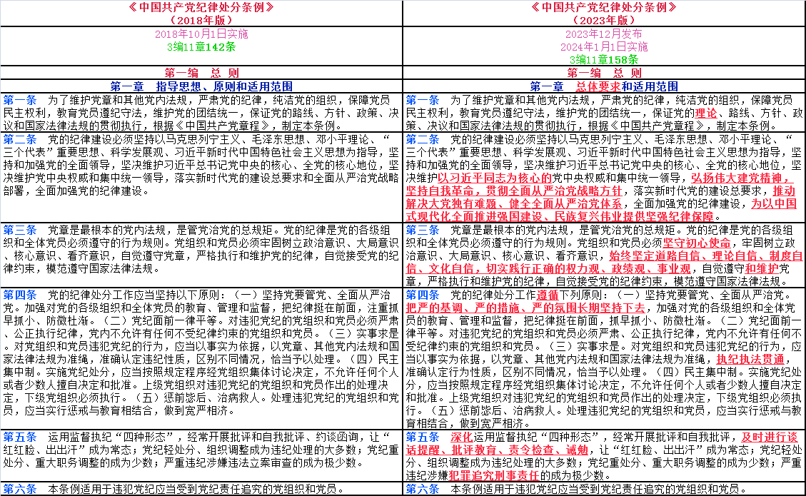 文中紅色字體帶下劃線部分為2023年12月版《中國共產(chǎn)黨紀(jì)律處分條例》修改后出現(xiàn)變化的內(nèi)容;文中紫色字體帶下劃線部分為2023年12月版《條例》修改后對(duì)2018年10月版《條例》中的部分文字進(jìn)行了刪減;文中綠色字體帶下劃線部分為2023年12月版《條例》修改后新增加的16個(gè)條款。