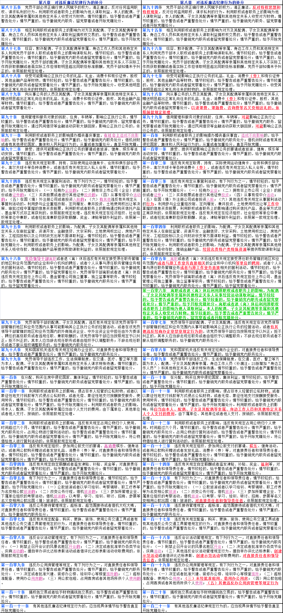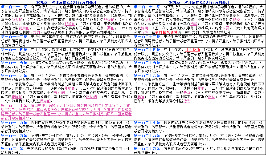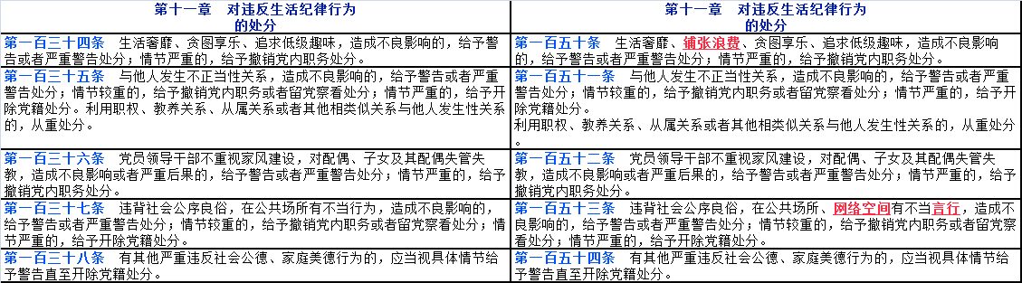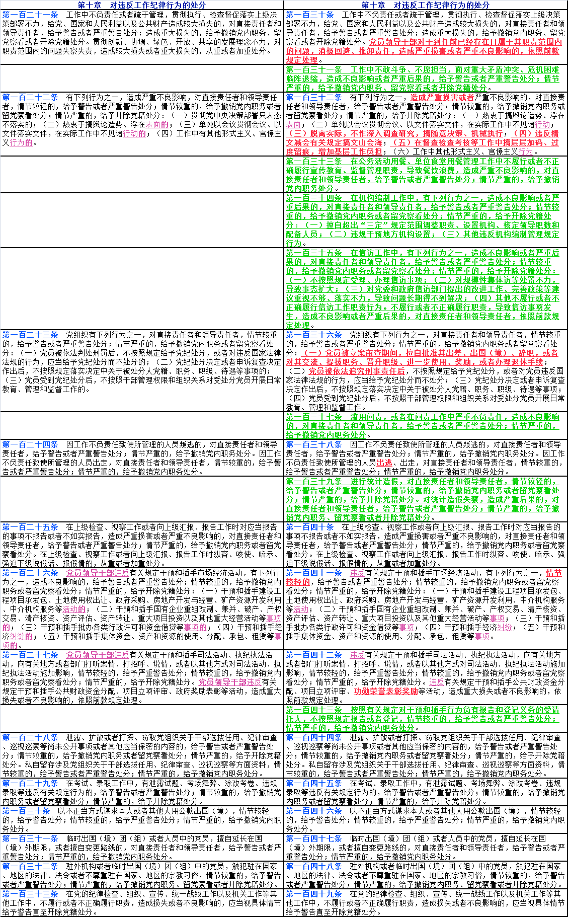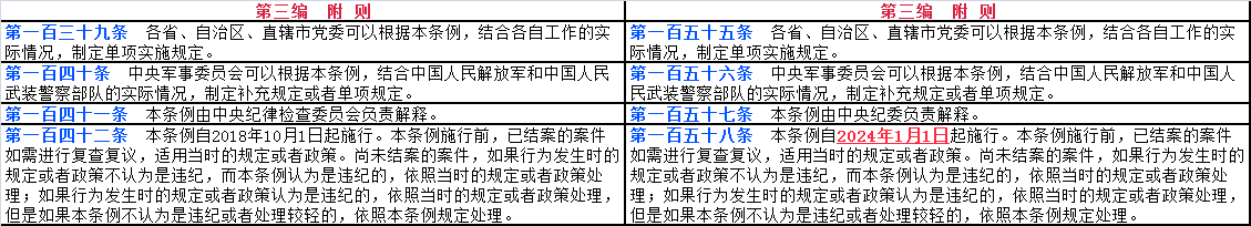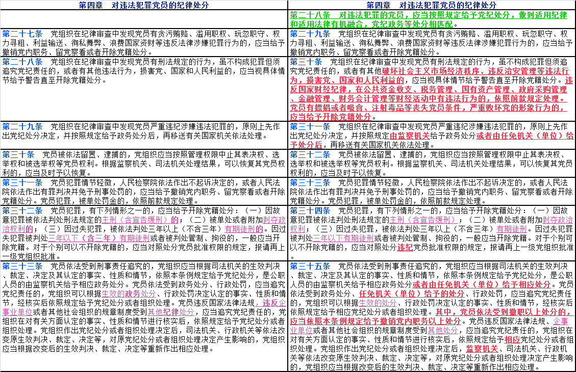 文中紅色字體帶下劃線部分為2023年12月版《中國共產(chǎn)黨紀(jì)律處分條例》修改后出現(xiàn)變化的內(nèi)容;文中紫色字體帶下劃線部分為2023年12月版《條例》修改后對(duì)2018年10月版《條例》中的部分文字進(jìn)行了刪減;文中綠色字體帶下劃線部分為2023年12月版《條例》修改后新增加的16個(gè)條款。