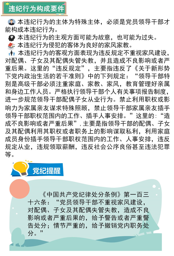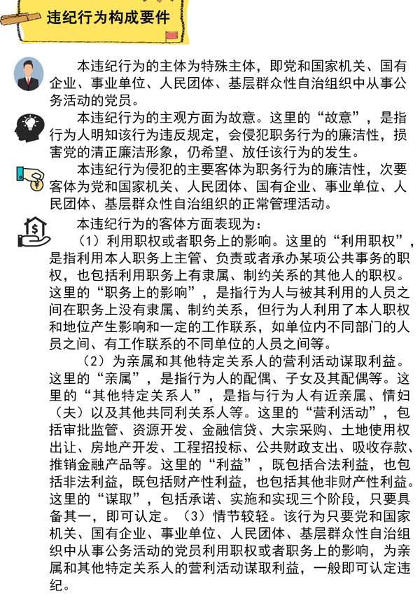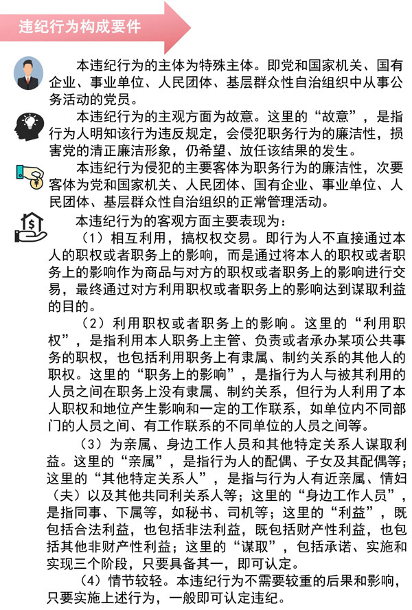 本違紀(jì)行為的客觀(guān)方面主要表現(xiàn)為:縱容、默許配偶、子女及其配偶等親屬、身邊工作人員和其他特定關(guān)系人利用黨員干部本人職權(quán)或者職務(wù)上的影響謀取私利,情節(jié)較輕。
