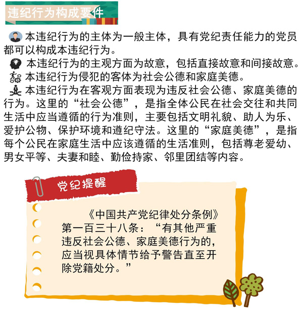 《中國(guó)共產(chǎn)黨紀(jì)律處分條例》第一百三十七條:“違背社會(huì)公序良俗,在公共場(chǎng)所有不當(dāng)行為,造成不良影響的,給予警告或者嚴(yán)重警告處分;情節(jié)較重的,給予撤銷(xiāo)黨內(nèi)職務(wù)或者留黨察看處分;情節(jié)嚴(yán)重的,給予開(kāi)除黨籍處分。”