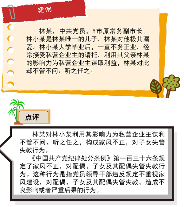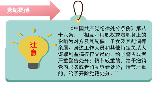 《中國(guó)共產(chǎn)黨紀(jì)律處分條例》第八十七條:“縱容、默許配偶、子女及其配偶等親屬、身邊工作人員和其他特定關(guān)系人利用黨員干部本人職權(quán)或者職務(wù)上的影響謀取私利,情節(jié)較輕的,給予警告或者嚴(yán)重警告處分;情節(jié)較重的,給予撤銷(xiāo)黨內(nèi)職務(wù)或者留黨察看處分;情節(jié)嚴(yán)重的,給予開(kāi)除黨籍處分。