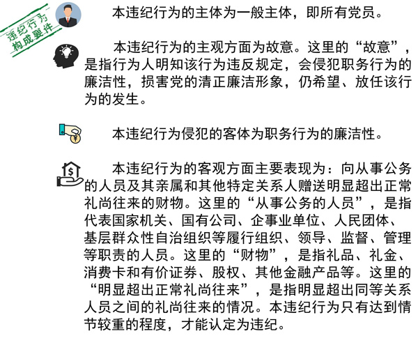 本違紀(jì)行為的主觀(guān)方面為故意。即行為人明知該行為違反規(guī)定,會(huì)侵犯職務(wù)行為的廉潔性,損害黨的清正廉潔形象,仍放任該行為的發(fā)生。