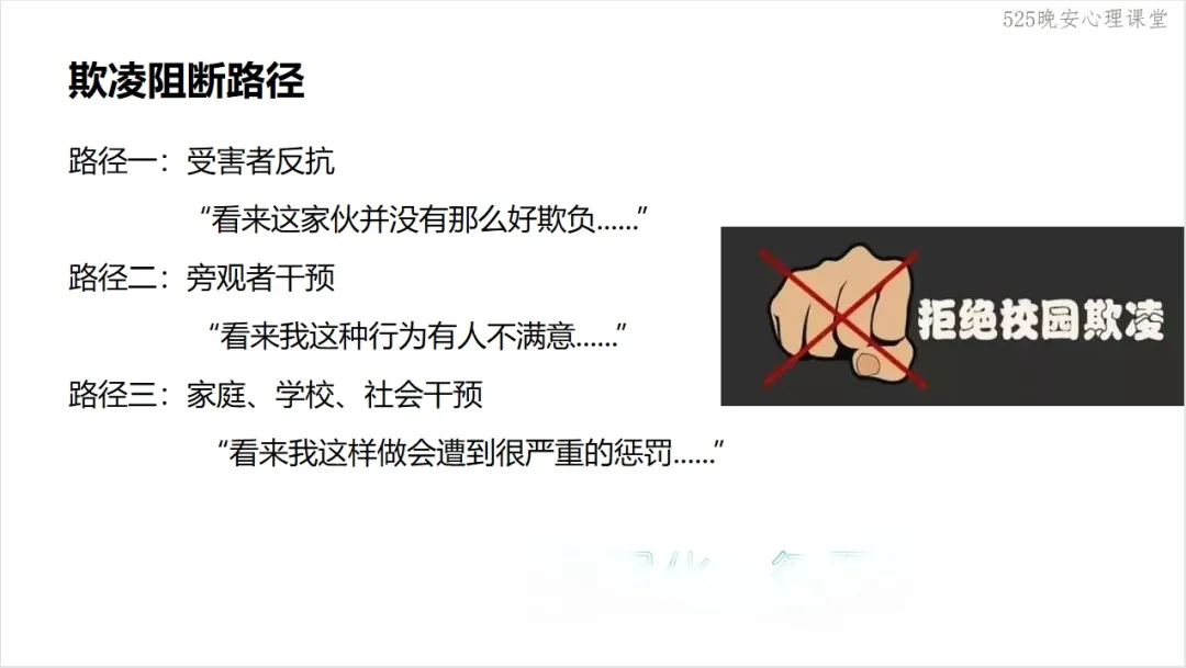 近日,保衛(wèi)部(武裝部)525心靈成長中心舉辦心理晚安課堂,幫助學生全方位認識校園欺凌及其對所有欺凌參與者(包括旁觀者)的不良影響,教會他們如何避免欺凌別人、被別人欺凌及如何勇于制止欺凌行為,幫助他們構建更具適應性的情緒管理機制和理性思考能力。