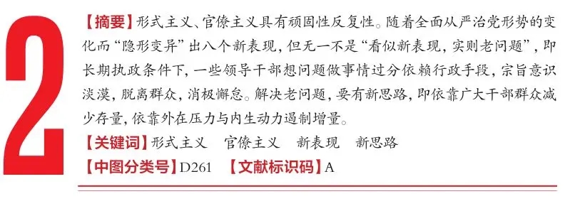 形式主義、官僚主義具有頑固性反復性,燃點低、蔓延快,隨著全面從嚴治黨形勢的變化而“隱形變異”、花樣翻新。黨的十八大以來,從制定和執(zhí)行中央八項規(guī)定開始,全黨自上而下糾正“四風”取得顯著成效。在這種形勢下,形式主義、官僚主義仍然改頭換面、大行其道。2017年黨的十九大后,新華社《形式主義、官僚主義新表現(xiàn)值得警惕》一文,總結(jié)了十種形式主義、官僚主義新表現(xiàn):一些領(lǐng)導干部調(diào)研走過場、搞形式主義,調(diào)研現(xiàn)場成了“秀場”;一些單位“門好進、臉好看”,就是“事難辦”;一些地方注重打造領(lǐng)導“可視范圍”內(nèi)的項目工程,“不怕群眾不滿意,就怕領(lǐng)導不注意”;有的地方層層重復開會,用會議落實會議;部分地區(qū)寫材料、制文件機械照抄,出臺制度決策“依葫蘆畫瓢”;一些干部辦事拖沓敷衍、懶政庸政怠政,把責任往上推;一些地方不重實效重包裝,把精力放在“材料美化”上,搞“材料出政績”;有的領(lǐng)導干部熱衷于將責任下移,“履責”變“推責”;有的干部知情不報、聽之任之,態(tài)度漠然;有的干部說一套做一套、臺上臺下兩個樣。