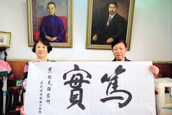 黃興長孫黃偉民及其妻子彭錫玲展示彭錫玲所臨摹的“篤實”