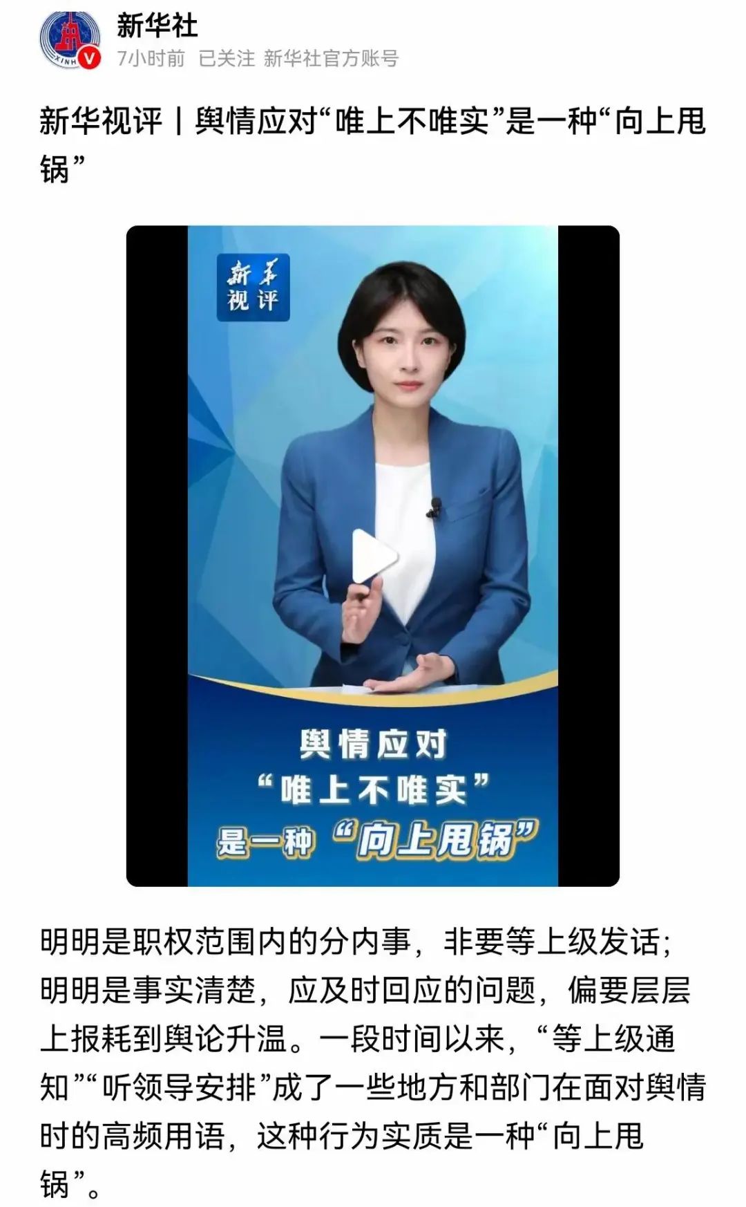 8月13日,新華社發(fā)表《新華視評(píng)丨輿情應(yīng)對(duì)“唯上不唯實(shí)”是一種“向上甩鍋”》。