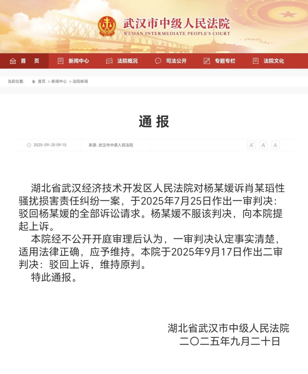 2025年9月17日,湖北省武漢市中級(jí)人民法院就楊某媛訴肖某瑫性騷擾損害糾紛一案作出二審判決,決定維持一審判決(7月25日,湖北省武漢經(jīng)濟(jì)技術(shù)開發(fā)區(qū)人民法院一審判決駁回楊某媛的全部訴訟請(qǐng)求)。學(xué)校本著充分尊重司法判決的原則,結(jié)合調(diào)查復(fù)核情況,決定撤銷肖某瑫記過(guò)處分。