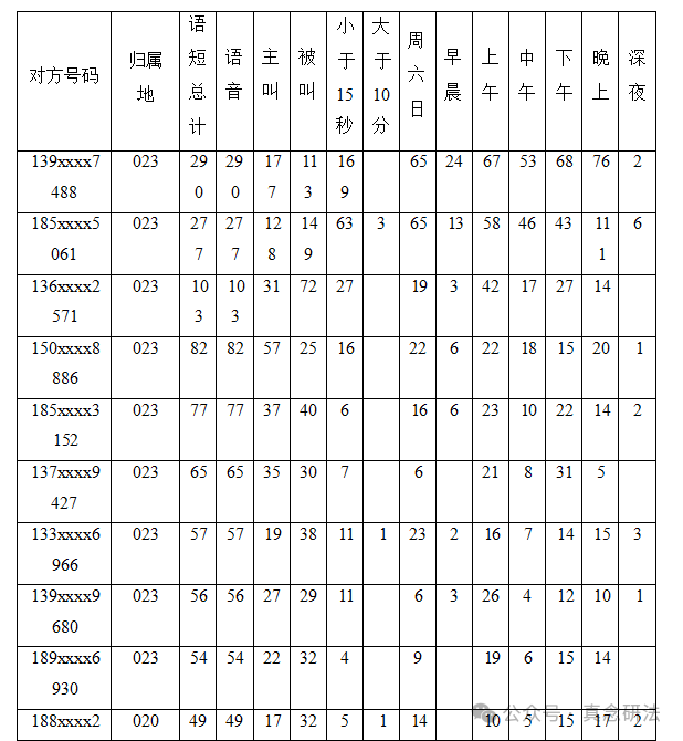 一般地,聯(lián)系最多的是其司機(jī),而且與司機(jī)的通話時(shí)間一般都在 15 秒以內(nèi),因?yàn)槠渑c司機(jī)通話主要是走與不走等三言兩語的話。上圖號(hào)碼一就是被調(diào)查對(duì)象司機(jī)的。其次聯(lián)系多的人一般是配偶或者家庭中的其他人員,時(shí)間可能多是晚上,通話時(shí)間偏長,上圖號(hào)碼二就是被調(diào)查對(duì)象妻子的。否則,是情人的可能性相當(dāng)大。這一點(diǎn)也被實(shí)踐印證。當(dāng)然,也有情人晚上基本上是不聯(lián)系的,還有的有多個(gè)情人,所以聯(lián)系人具體是什么身份,還要結(jié)合其他信息判定。