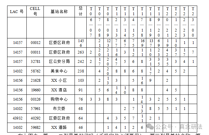 在上圖中,第一、二列是基站代碼(手機(jī)定位必須要用),第三列是基站名稱,第四列是通話時(shí)基站位置排序。后面幾列是時(shí)間段,如 6-7 點(diǎn)、7-8 點(diǎn),下面幾行內(nèi)的數(shù) 字是在某時(shí)間段內(nèi)被查號(hào)碼通話的次數(shù)。假如上圖是該號(hào)碼在近6個(gè)月內(nèi)的通話記錄分析結(jié)果,那么第二行第四列的 1456 就表明該號(hào)碼在近 3 個(gè)月內(nèi)在某區(qū)委區(qū)政府基站位置通話1456次,其后的263也是在該基站位置。在區(qū)公安分局基站位置通話次數(shù)是242次。其在區(qū)委區(qū)政府基站位置通話次數(shù)遠(yuǎn)遠(yuǎn)大于在區(qū)公安分局等基站位置,這說明機(jī)主活動(dòng)范圍就在區(qū)委區(qū)政府一帶。第二行第十四列的 19 數(shù)字就表明在該基站位置機(jī)主在20-21 點(diǎn)通話次數(shù)為 19 次。上圖表明在 22-24 點(diǎn)機(jī)主也主要在區(qū)委區(qū)政府基站位置,這說明機(jī)主住的地方也在區(qū)委區(qū)政府一帶。實(shí)際情況是機(jī)主是在區(qū)委區(qū)政府大樓上班,也居住在區(qū)委區(qū)政府附近的小區(qū)。第一個(gè)區(qū)委區(qū)政府基站位置表明他上班時(shí)主要在的地方,第二個(gè)區(qū)委區(qū)政府基站位置表明他晚上休息時(shí)所在的地方。我們還可以通過查找被調(diào)查對(duì)象周末、重大節(jié)假日(如春節(jié))及其早上和夜晚手機(jī)通話基站位置確定其家人住址,這對(duì)家在外地的被調(diào)查對(duì)象更有針對(duì)性。同時(shí),結(jié)合其家人手機(jī)通話情況確定家庭住地更準(zhǔn)確。我們可以對(duì)比被調(diào)查對(duì)象與有關(guān)人員(如情人)的基站代碼(同網(wǎng)用戶直接比對(duì),非同網(wǎng)的需要還原基站位置),以確定在一起的頻率與地點(diǎn)。還可以比對(duì)基站位置,確定被調(diào)查對(duì)象特定時(shí)間是否和誰在一塊,當(dāng)然,需要他們那一時(shí)間點(diǎn)前后都要有通話記錄才行。通過上圖, 我們既可以分析出被調(diào)查對(duì)象的活動(dòng)半徑、辦公住家地點(diǎn),也可以結(jié)合相關(guān)人員的住家地點(diǎn)、辦公地點(diǎn)、電話號(hào)碼等情況進(jìn)行排查關(guān)系人。