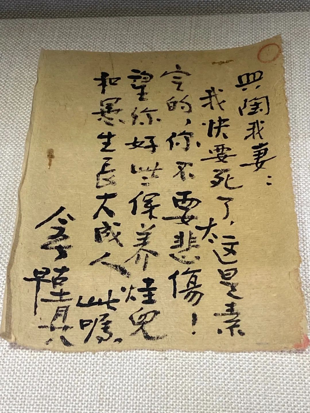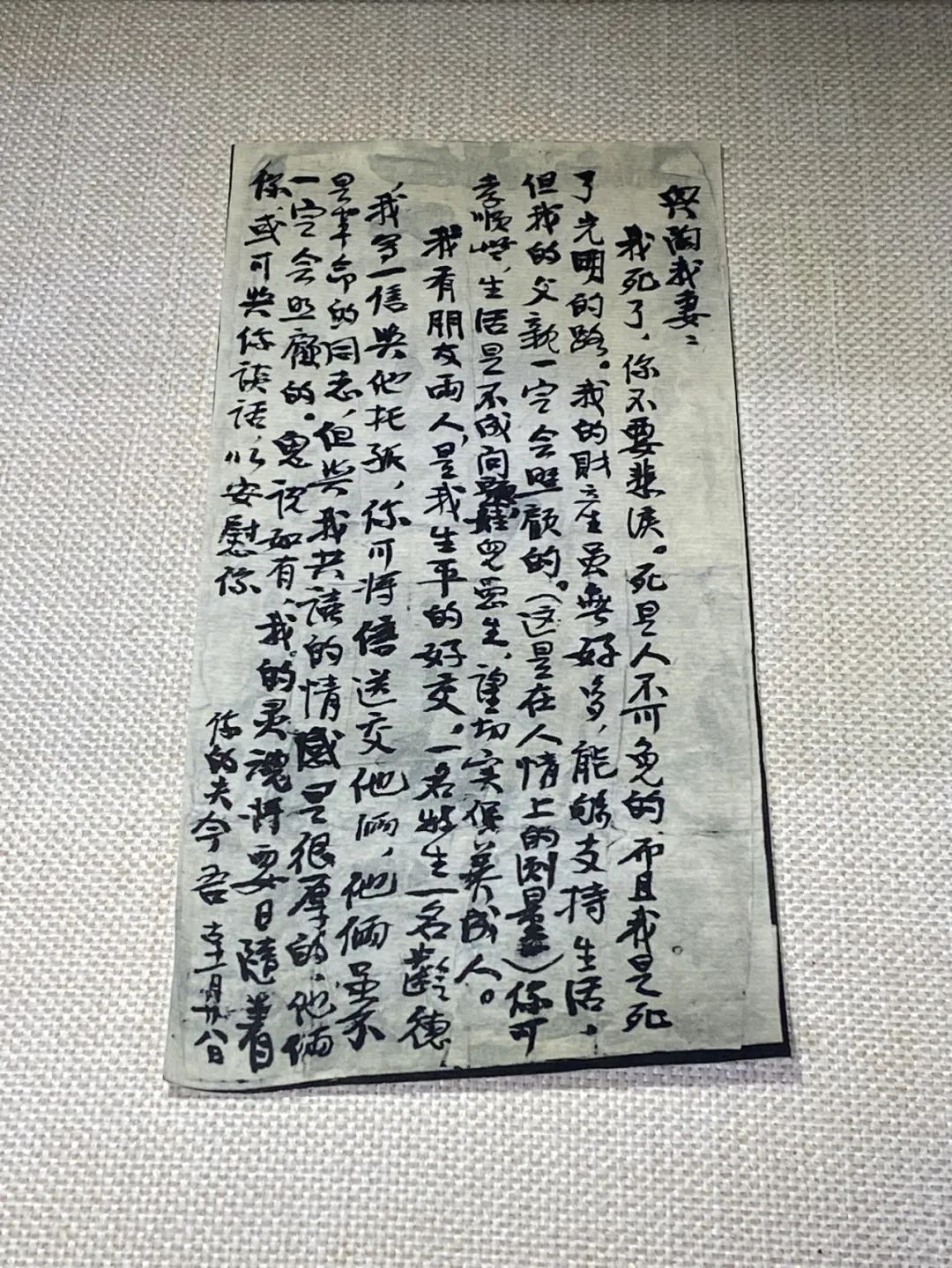 在衡陽黨史館一個壁龕柜內(nèi),展陳著幾片泛黃的字紙,在燈光映照下,一絲不茍的字跡中,“戴今吾”三個字格外醒目。這就是戴今吾烈士在生命的最后時刻,寫給妻子的絕筆書。